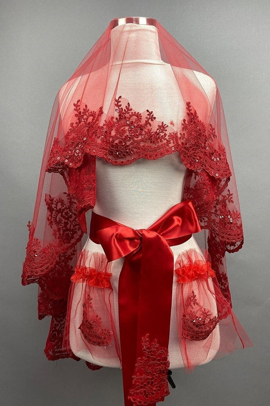 Kırmızı Gelin Duvağı ve Kına Gecesi Yüz Örtüsü – Pul ve Tül Detaylı Özel Tasarım
