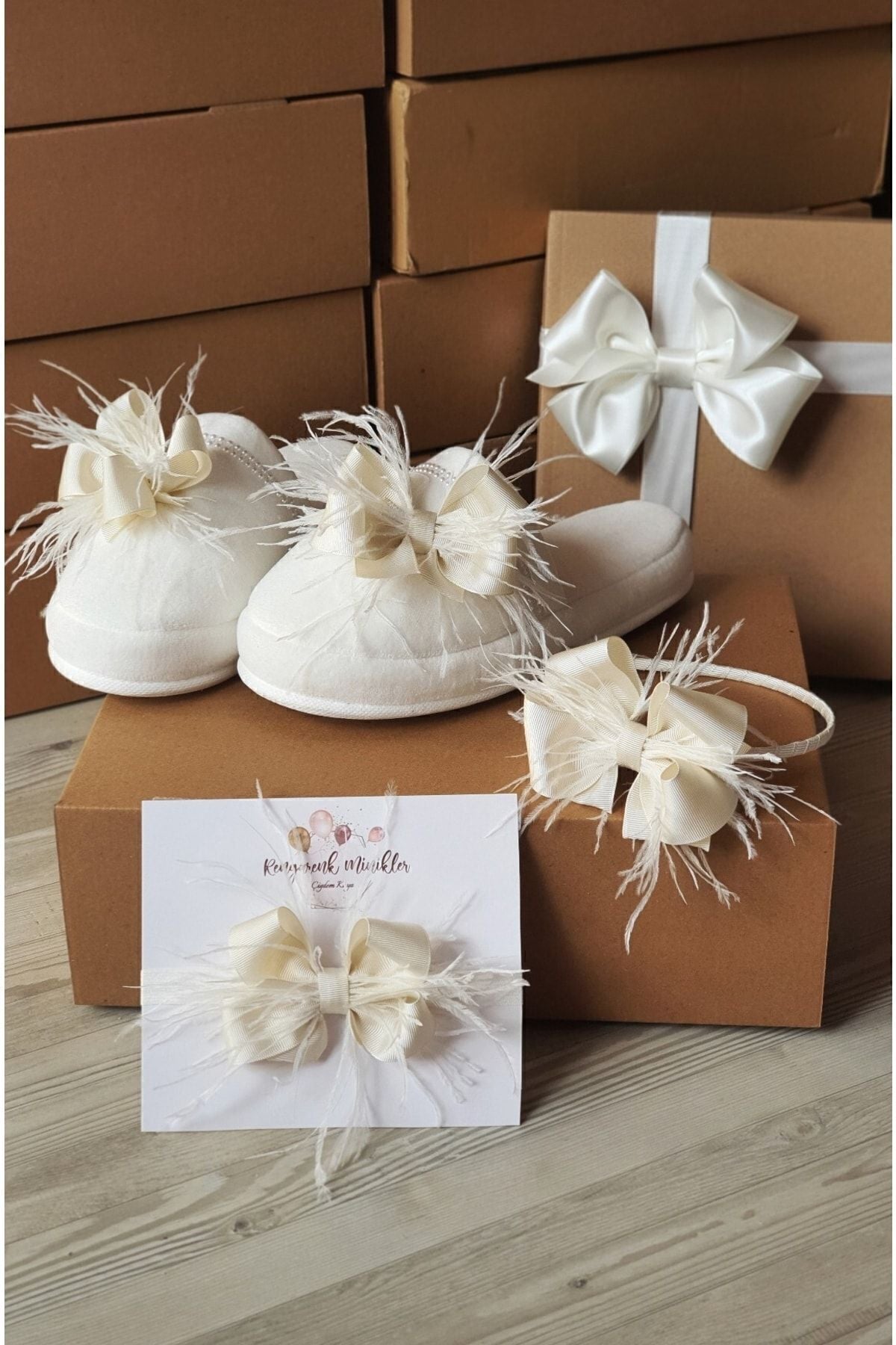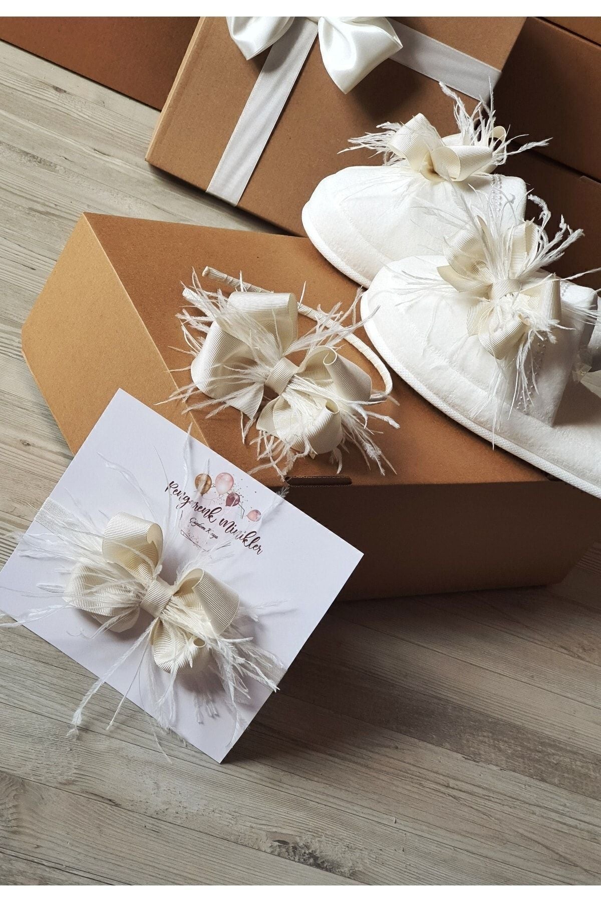 Umstands-Hausschuh-Set mit Krone für Mutter und Baby mit pelziger Schleife