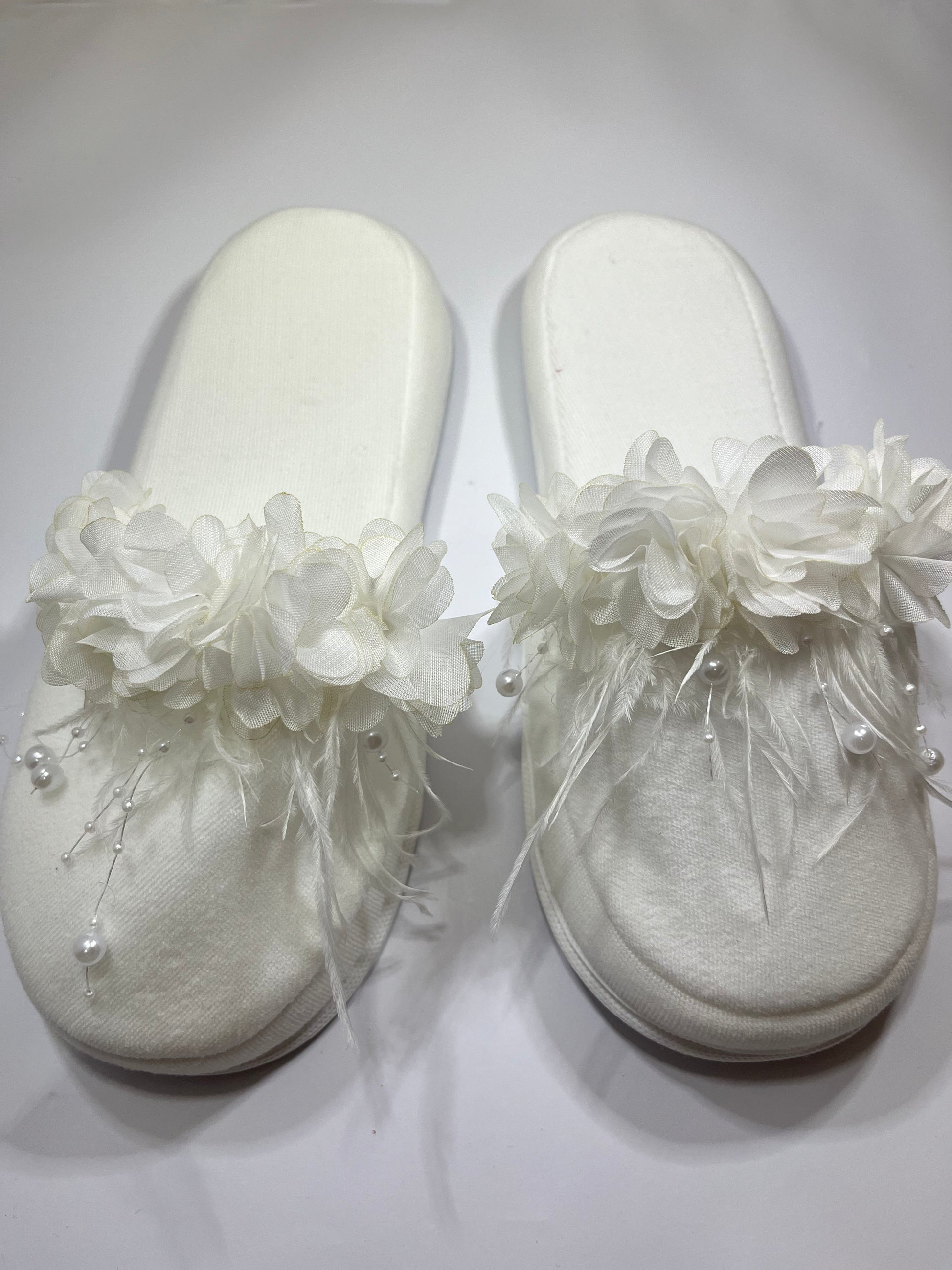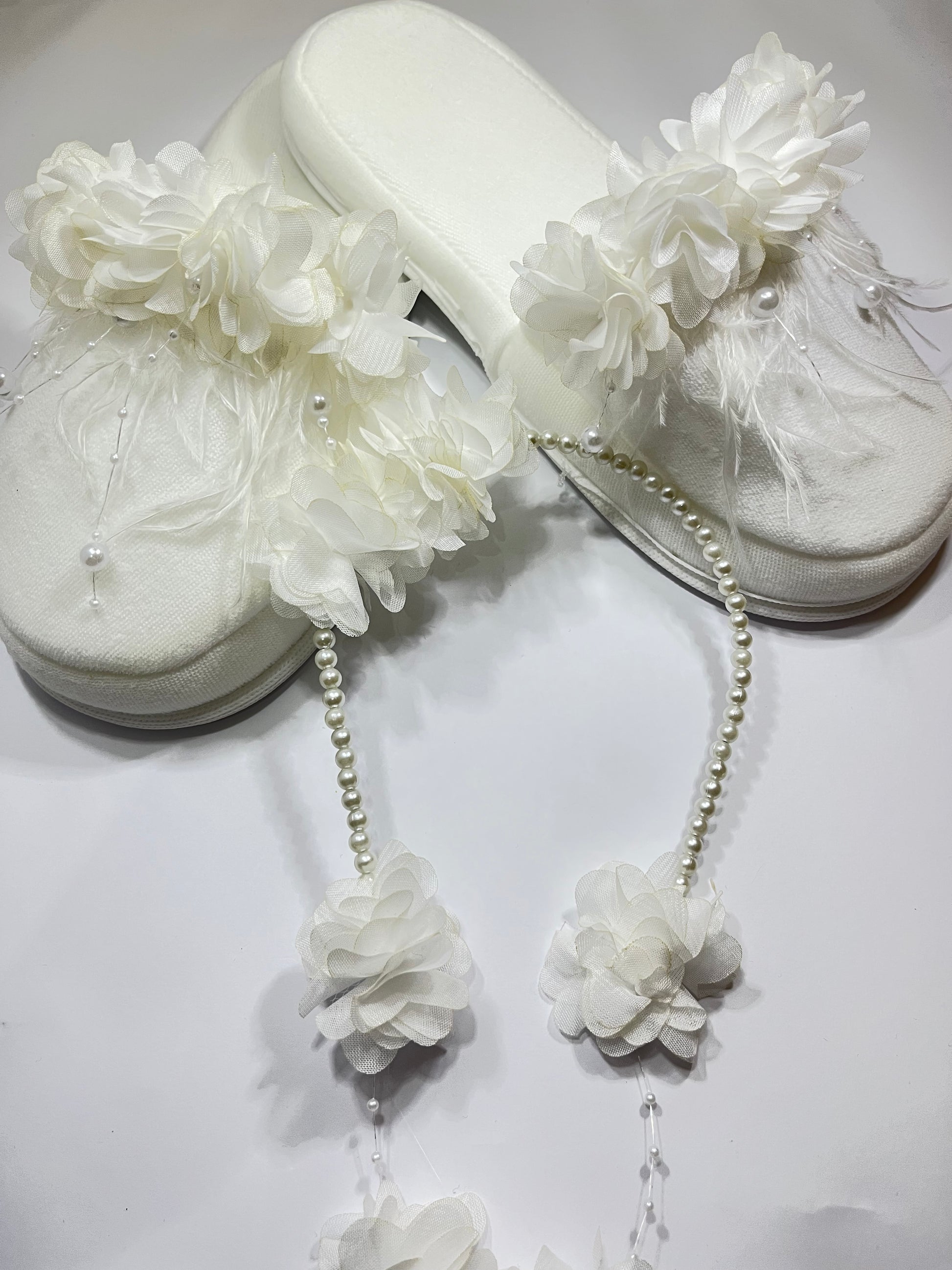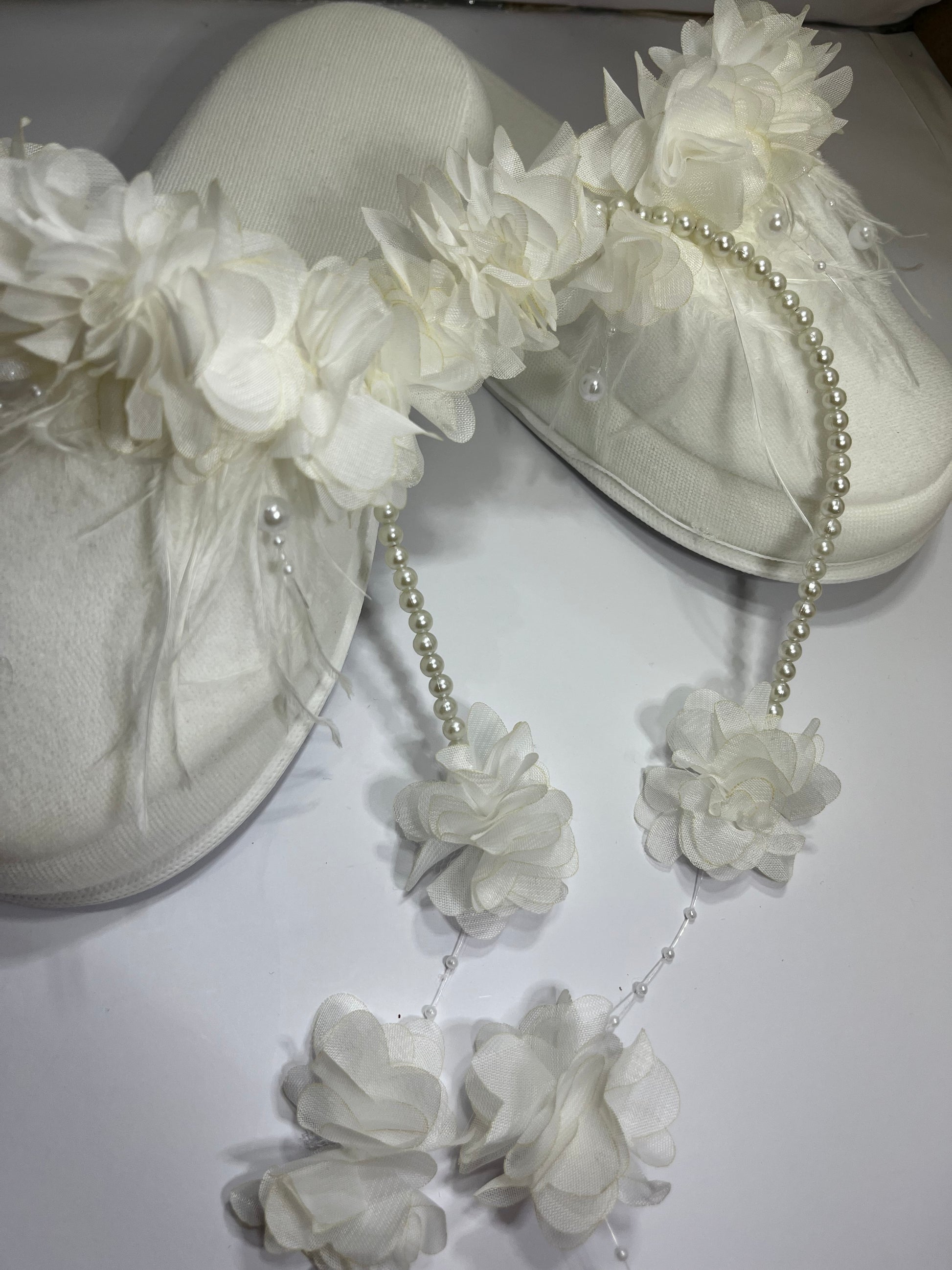 Dieses weiße, geblümte, perlenbesetzte Set aus Umstandspantoffeln und Diadem rundet Ihre besonderen Momente nach der Geburt perfekt ab. Es wurde mit seinem eleganten und bequemen Design sorgfältig für Mütter gefertigt. Mit diesem stilvollen, handgefertigten Set können Sie Ihre Gäste elegant und bequem begrüßen.
