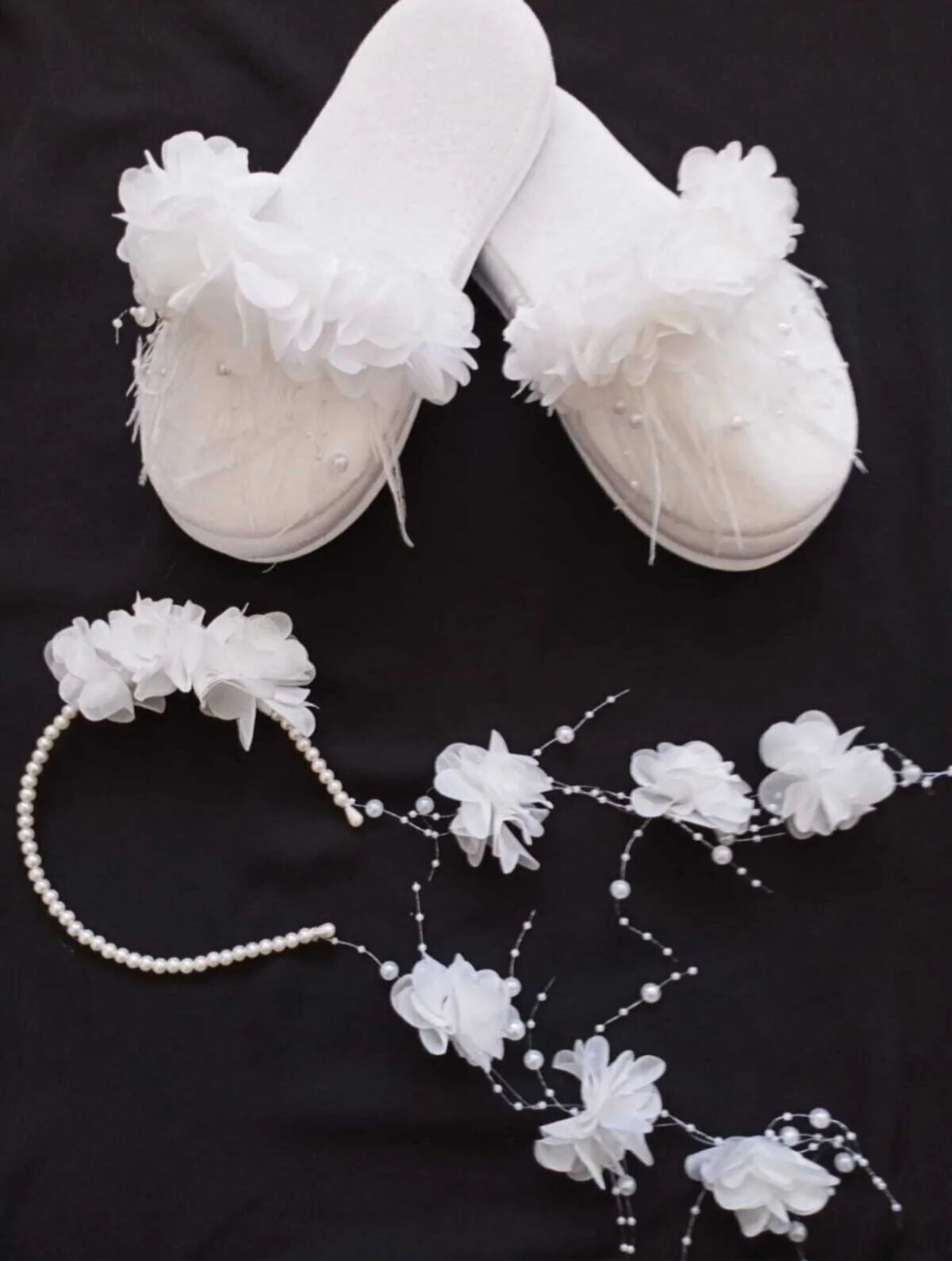 Weißes Set aus geblümten, pelzigen Umstandspantoffeln und einer perlenbesetzten Umstandskrone