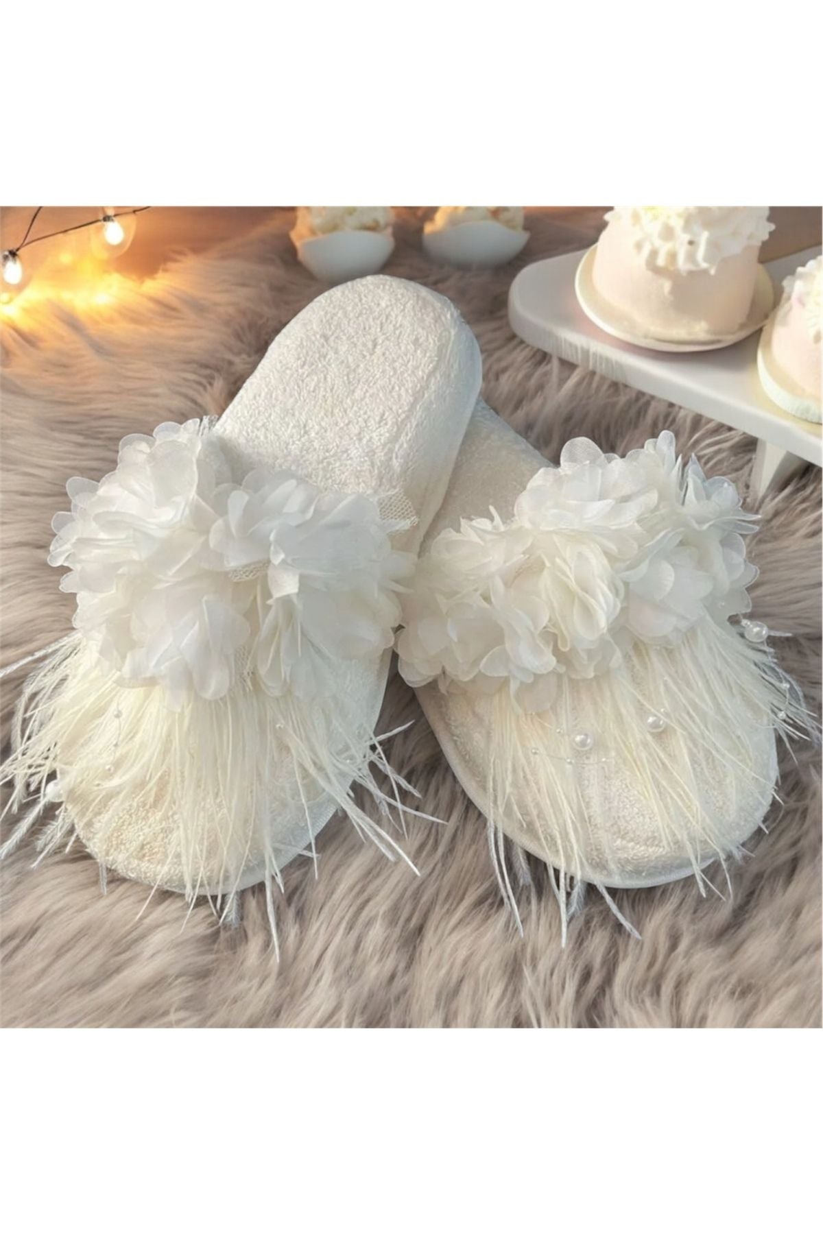 Weiße, pelzige Umstandspantoffeln mit Laser-Blumenmuster
