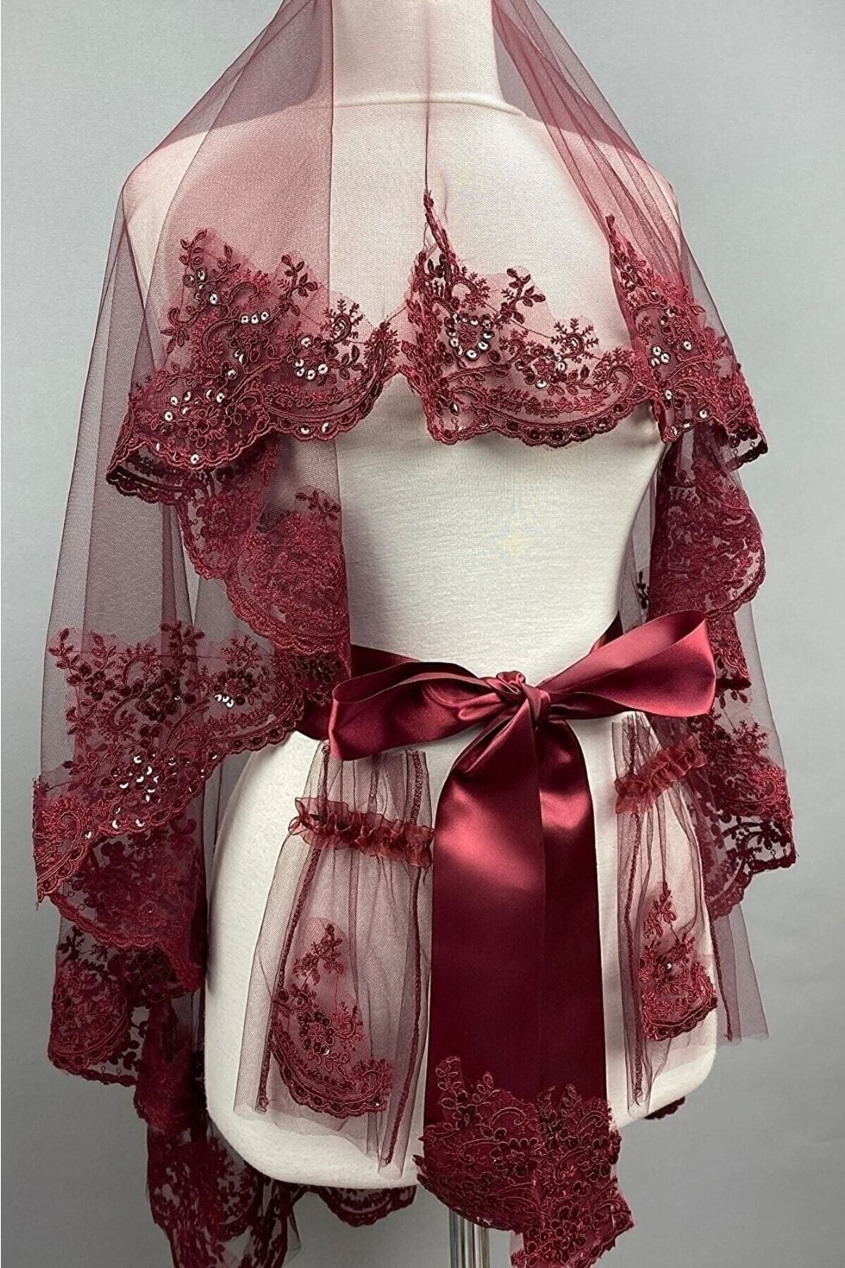 Burgunderroter luxuriöser Guipure Henna Cover Set Schleier