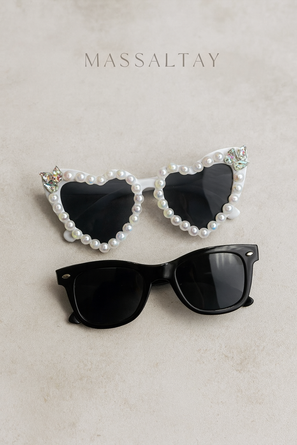Gelin after partisi ve özel kutlamalar için tasarlanmış şık gözlük seti! Işıltılı inci ve taş detaylı beyaz kalp model gözlük, gelinlere eğlenceli ve dikkat çekici bir tarz sunarken; siyah klasik model gözlük ise arkadaşlar ve yakınlar için mükemmel bir tamamlayıcıdır.
