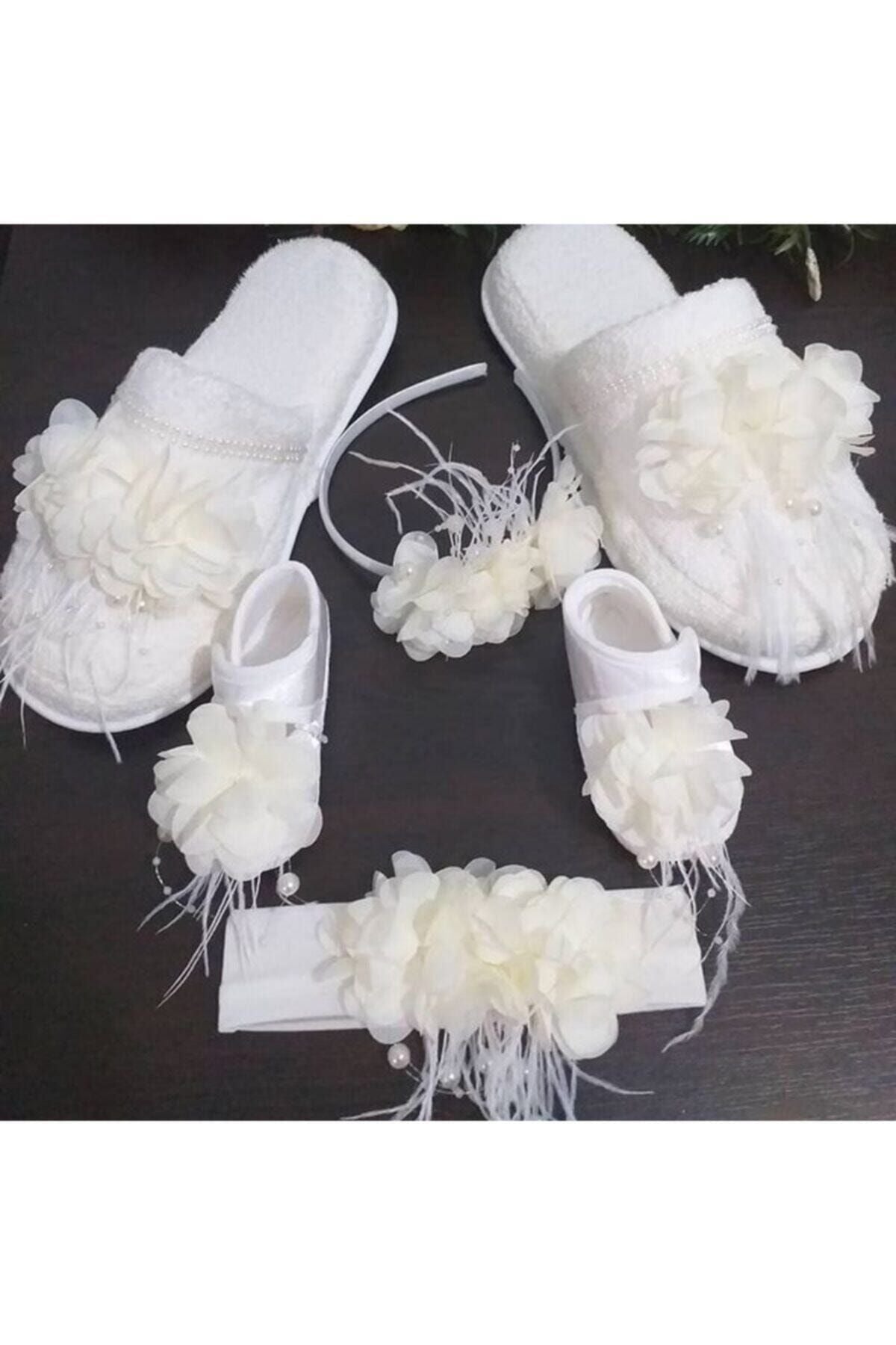 Cremefarbenes Umstands-Hausschuhe-Set für Damen, Babyschuhe mit Krone und Bandana mit Federperlen