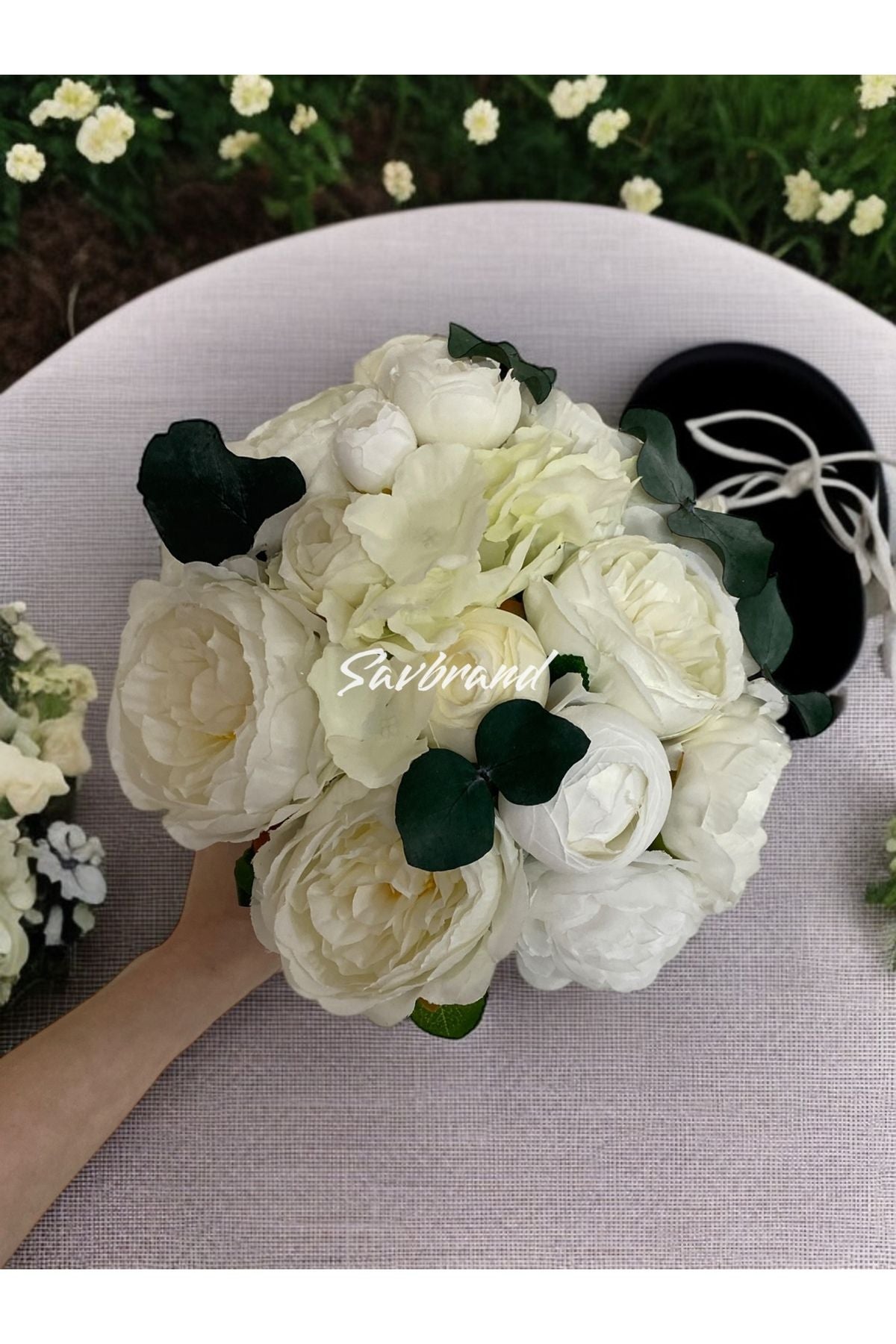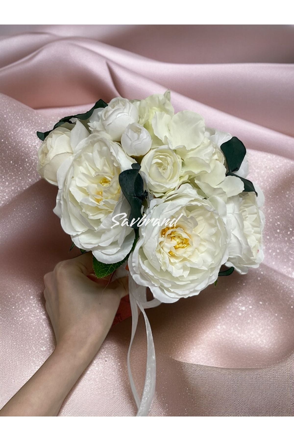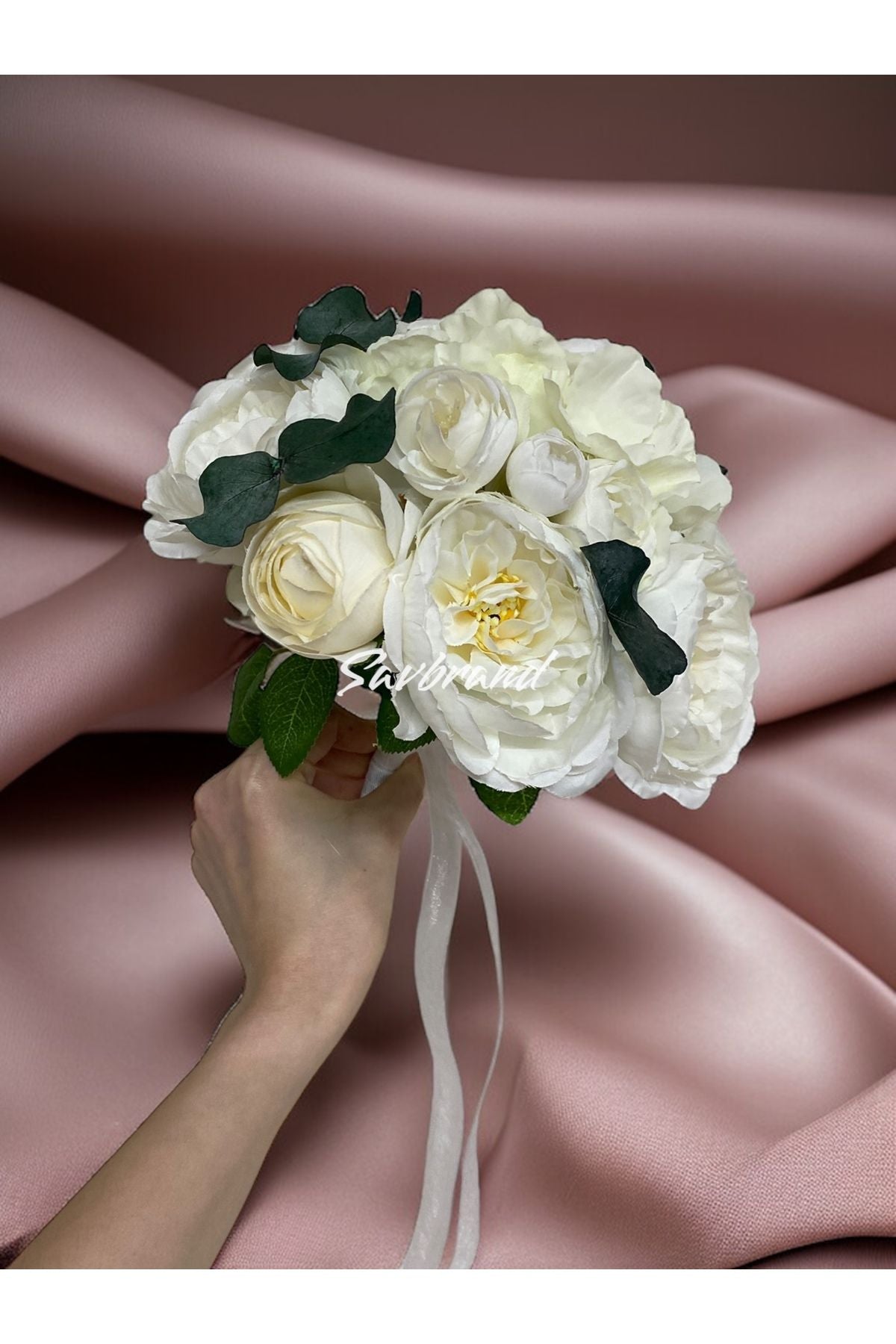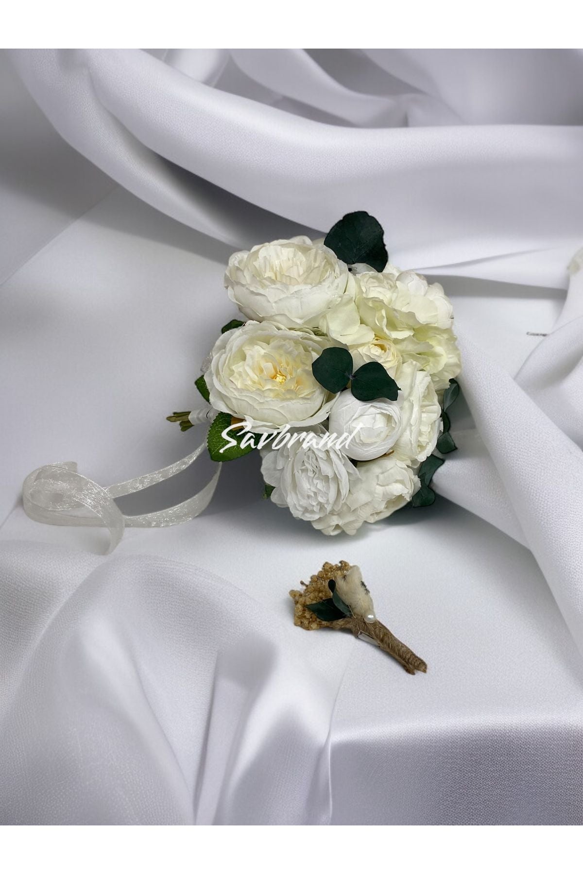 Cremefarbener Pfingstrosen-Eukalyptus-Luxus-Brautstrauß und Boutonniere