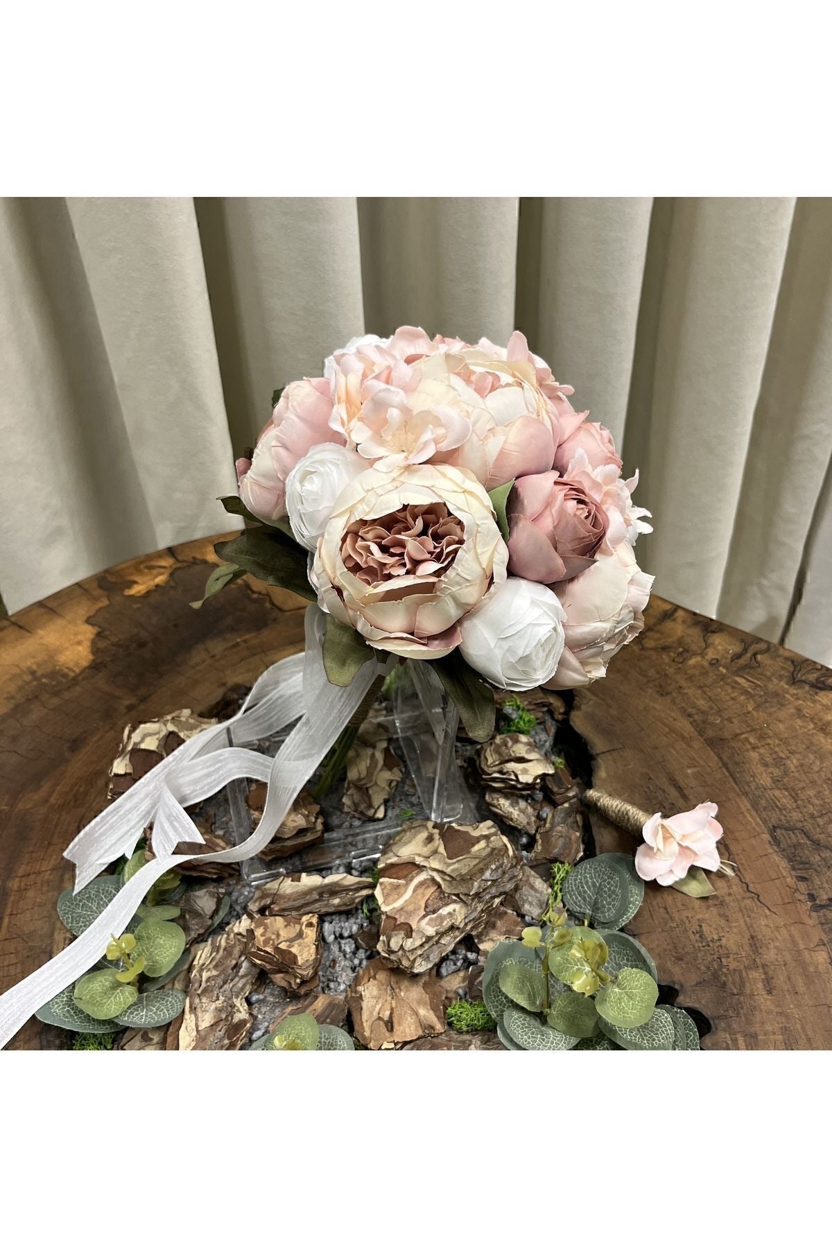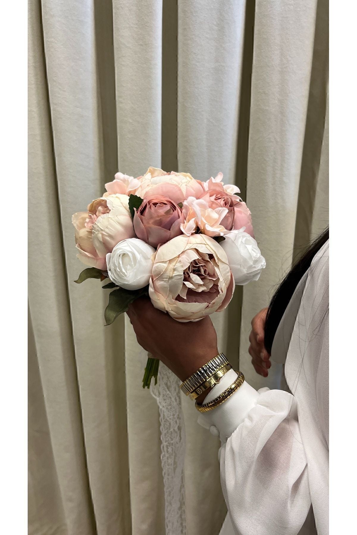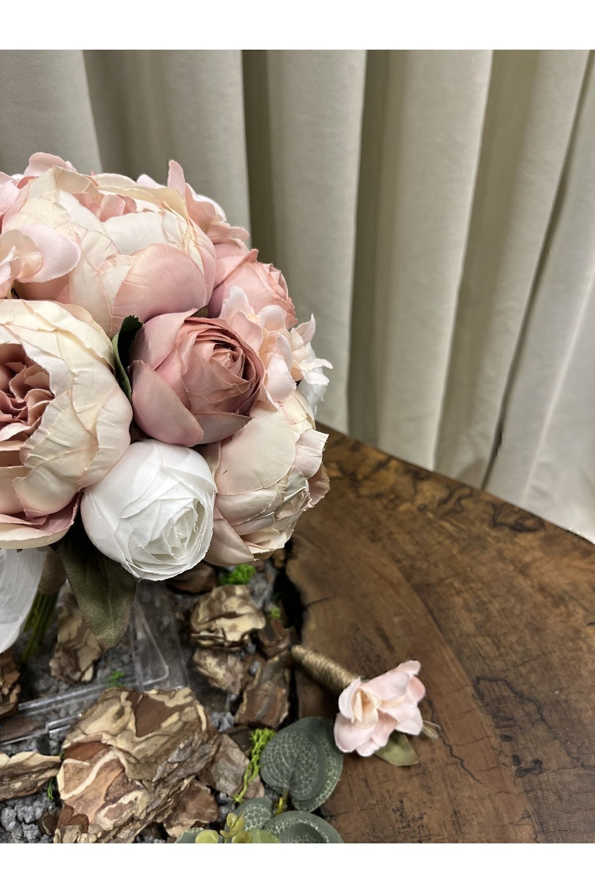 Rosa und weißer Pfingstrosen-Brautstrauß - Brautstrauß - Bräutigam-Ansteckblume - Künstliche Blume