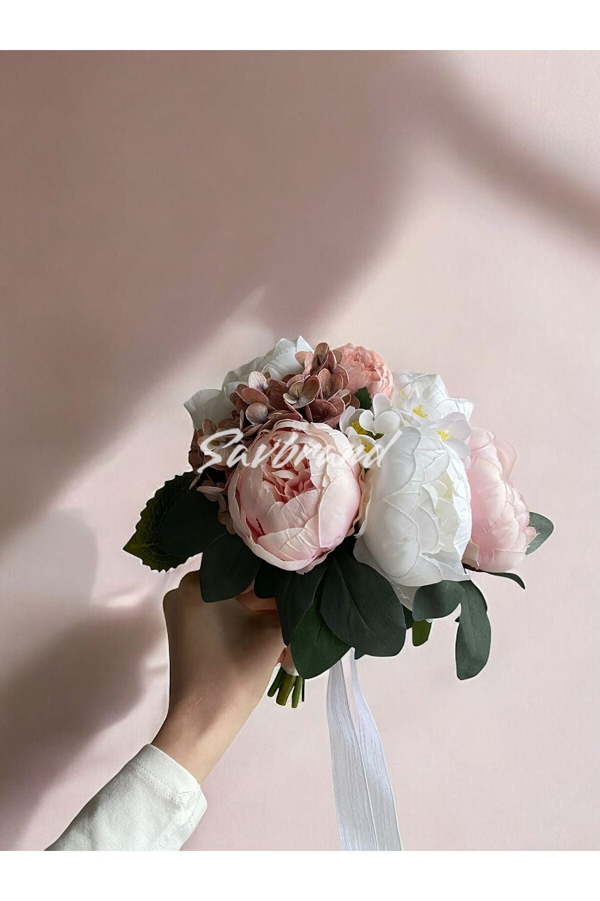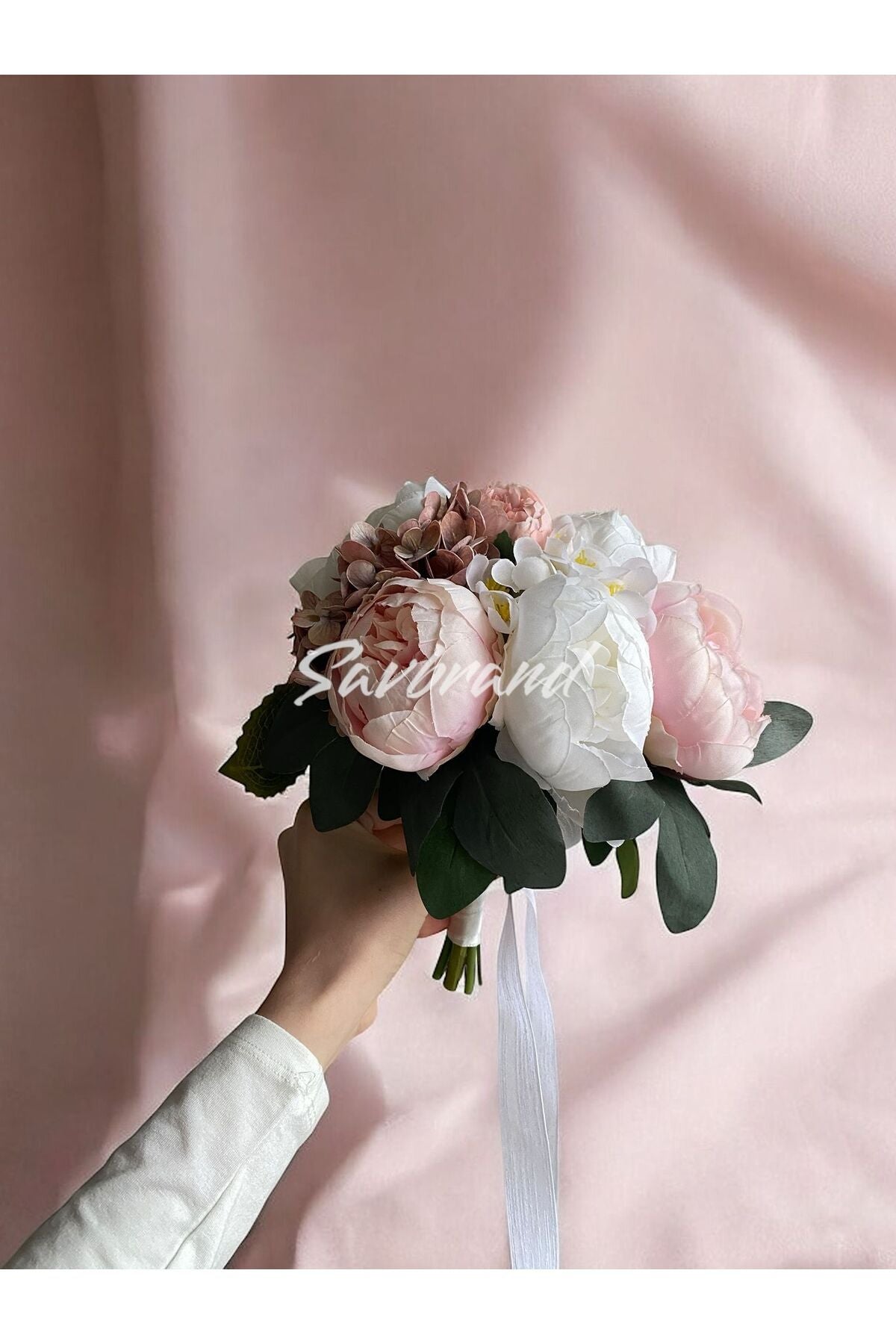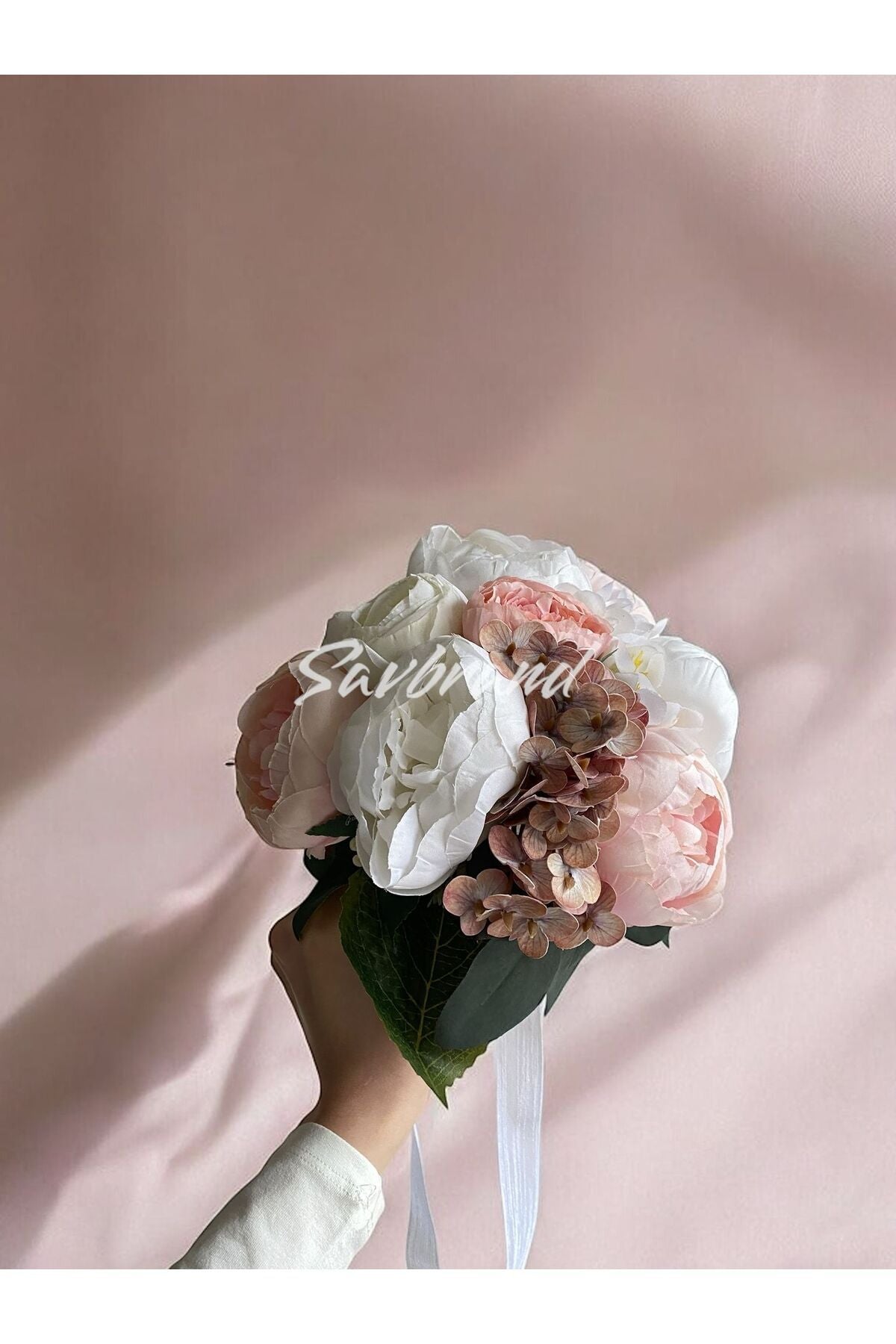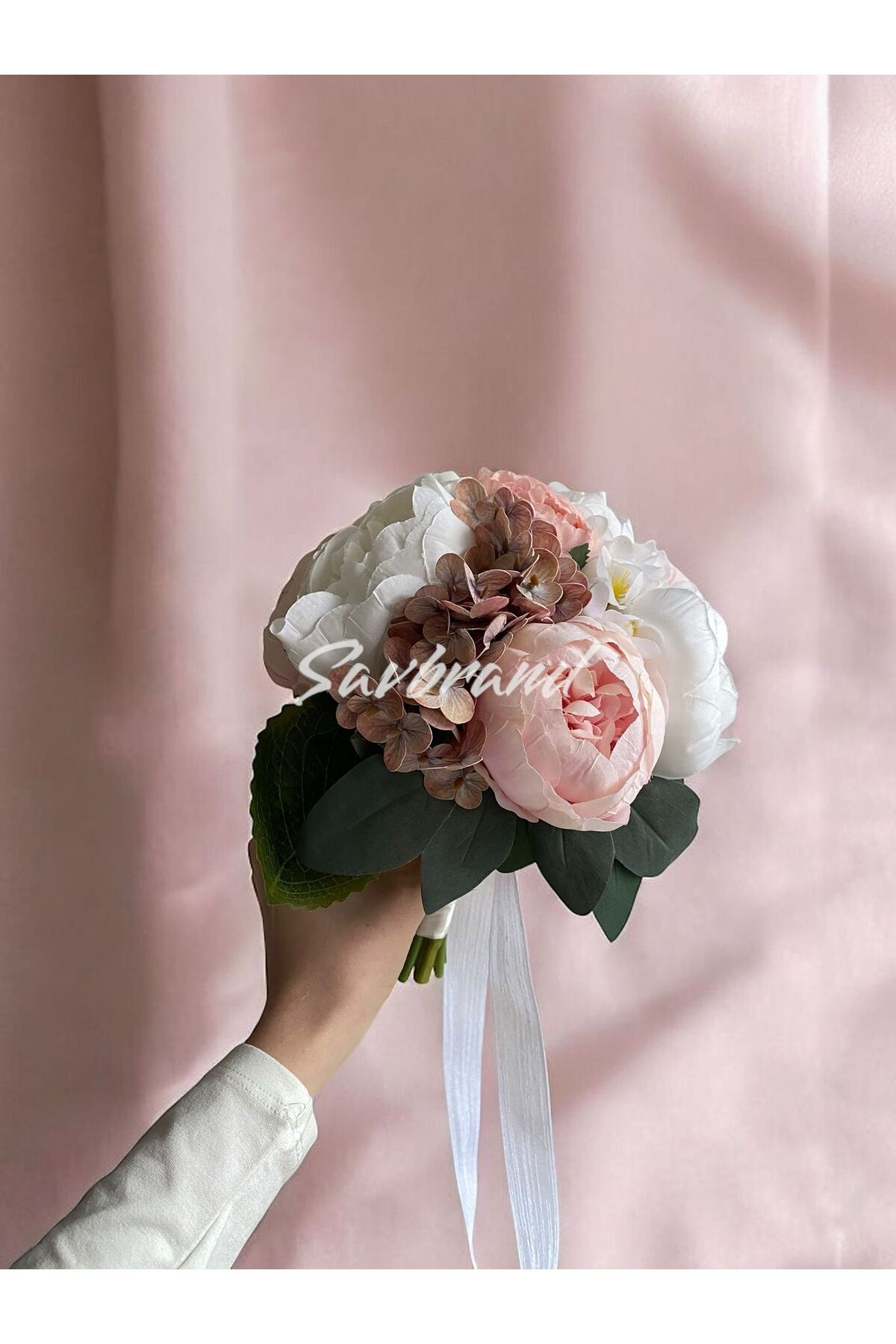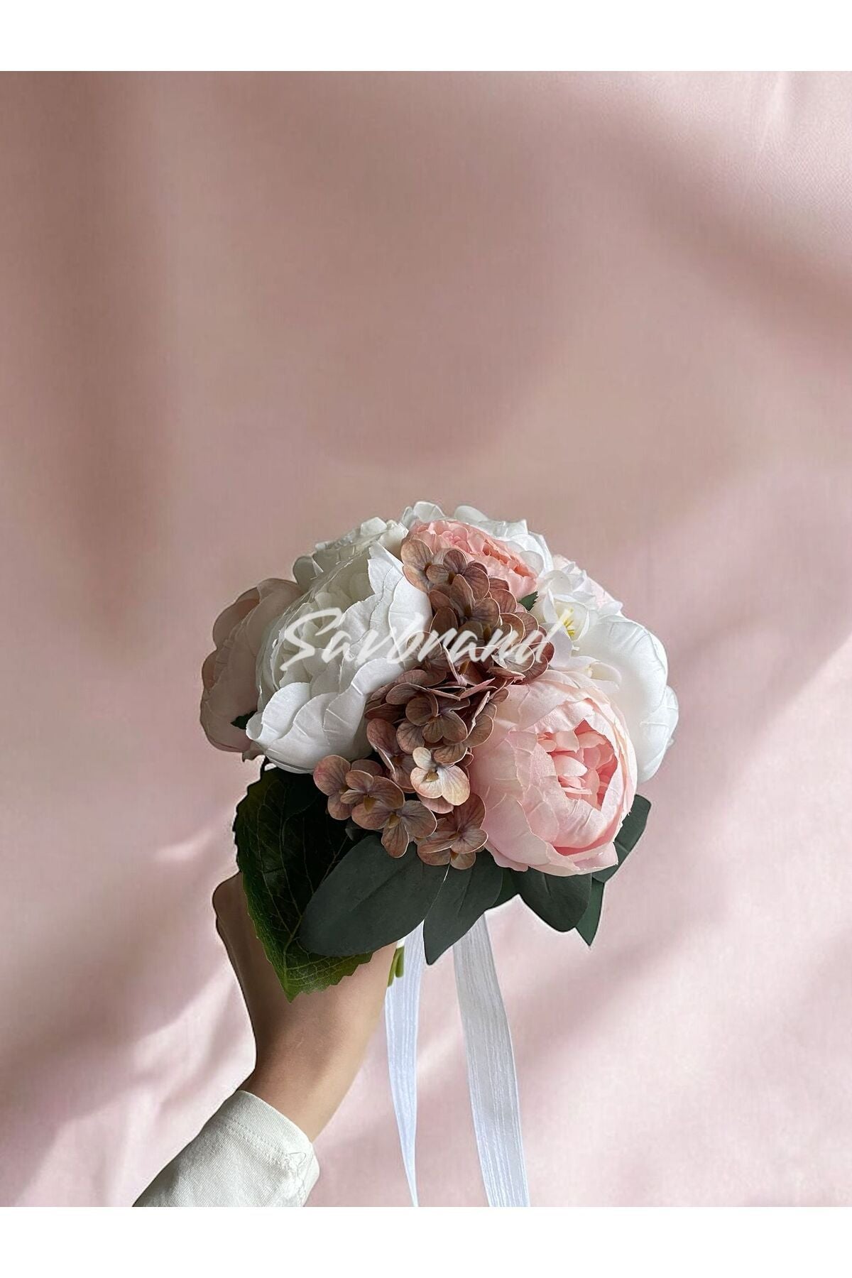 Brautstrauß mit zarter Pfingstrose, feuchter Hortensie und Rose im Spezialdesign
