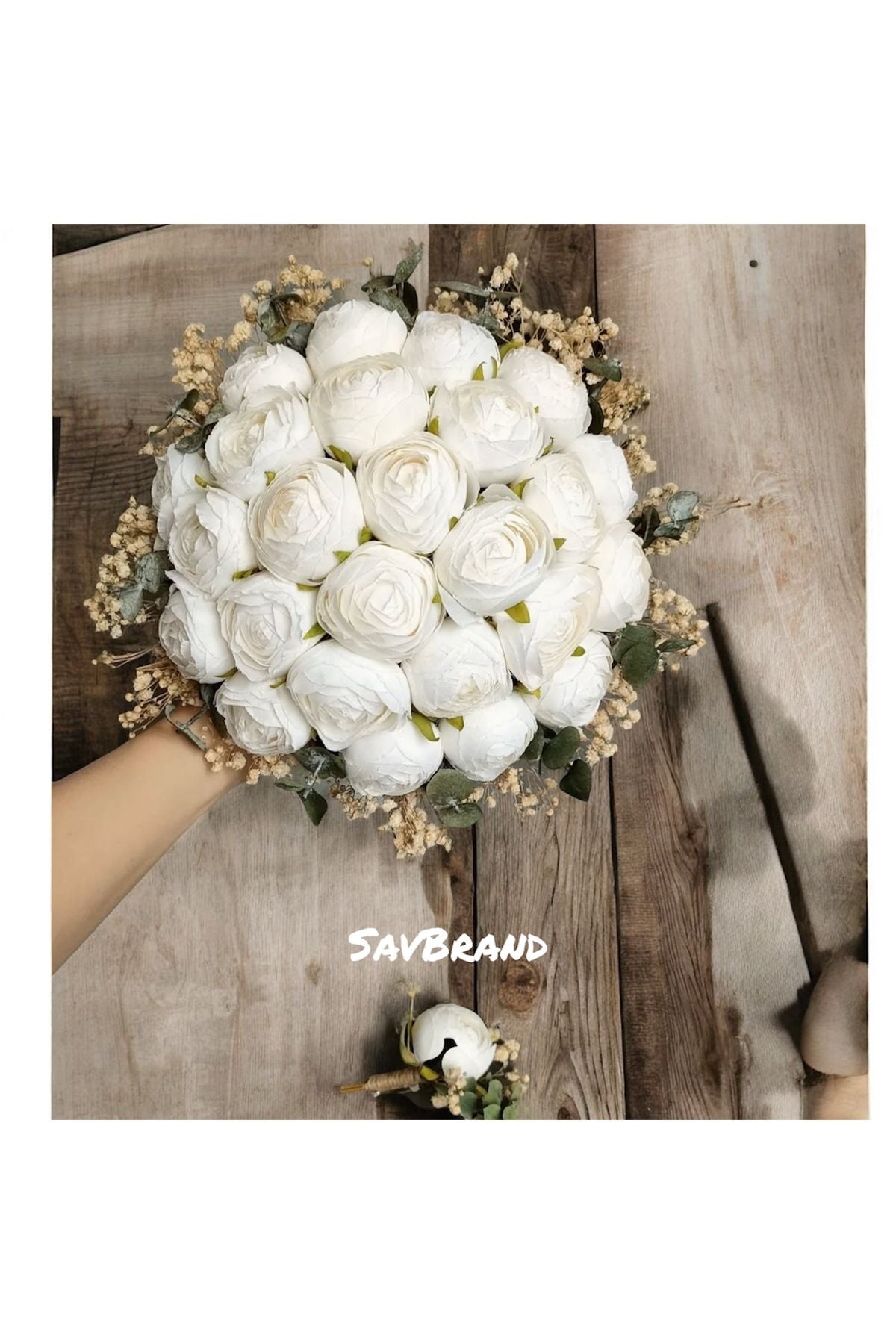 Pfingstrosenknospe, Gips-Eukalyptus-Brautstrauß, Pfingstrosen- und Gips-Brautstrauß