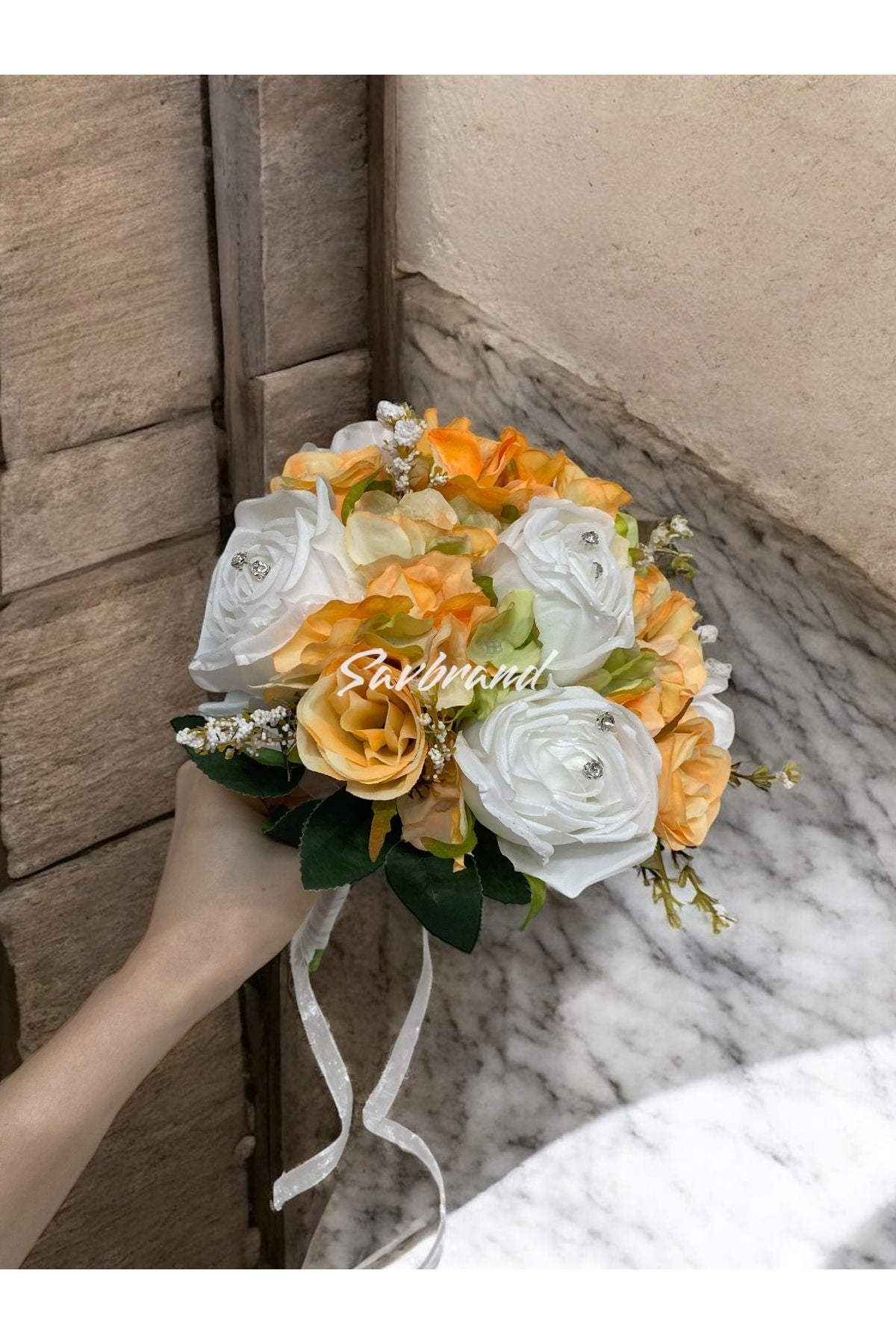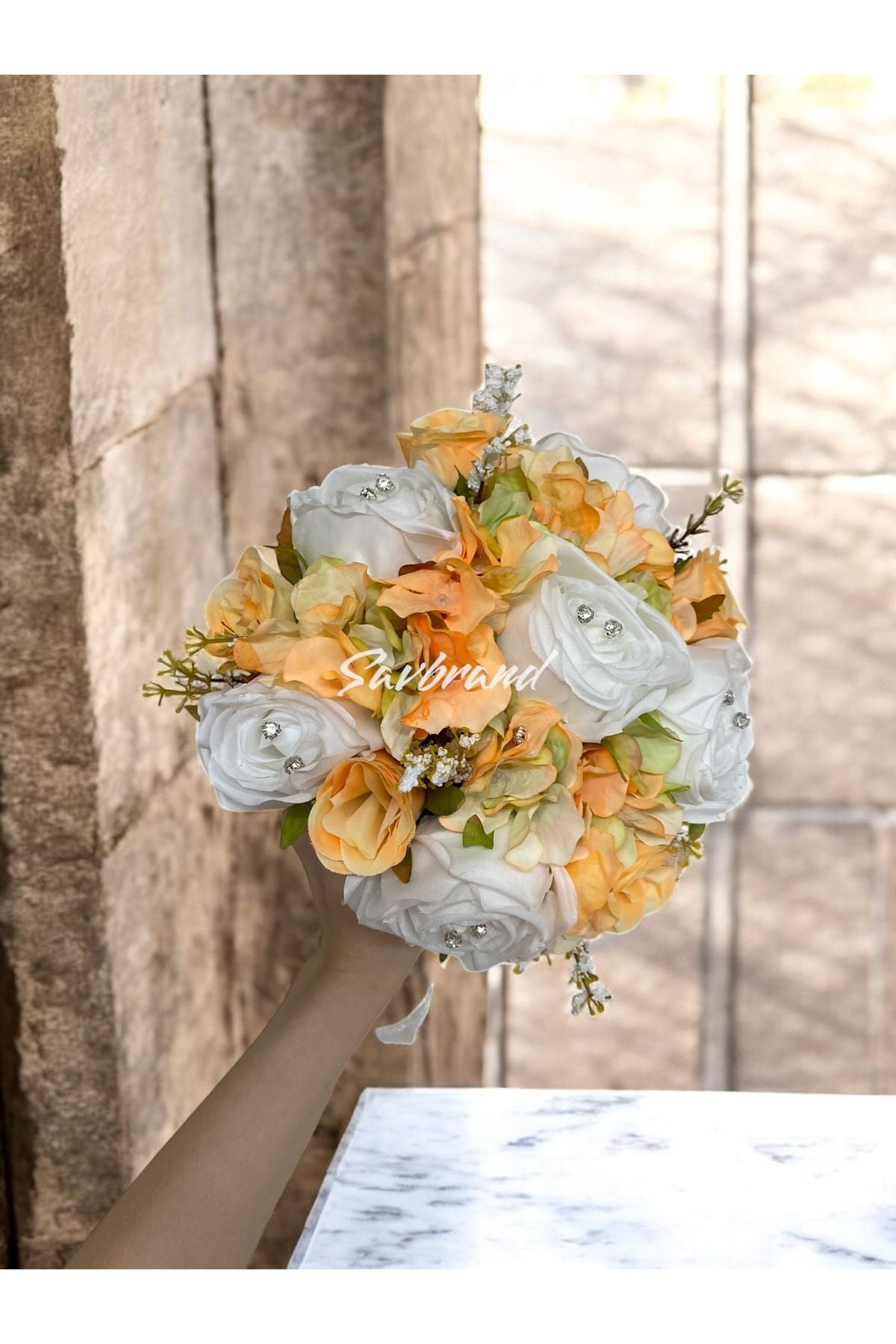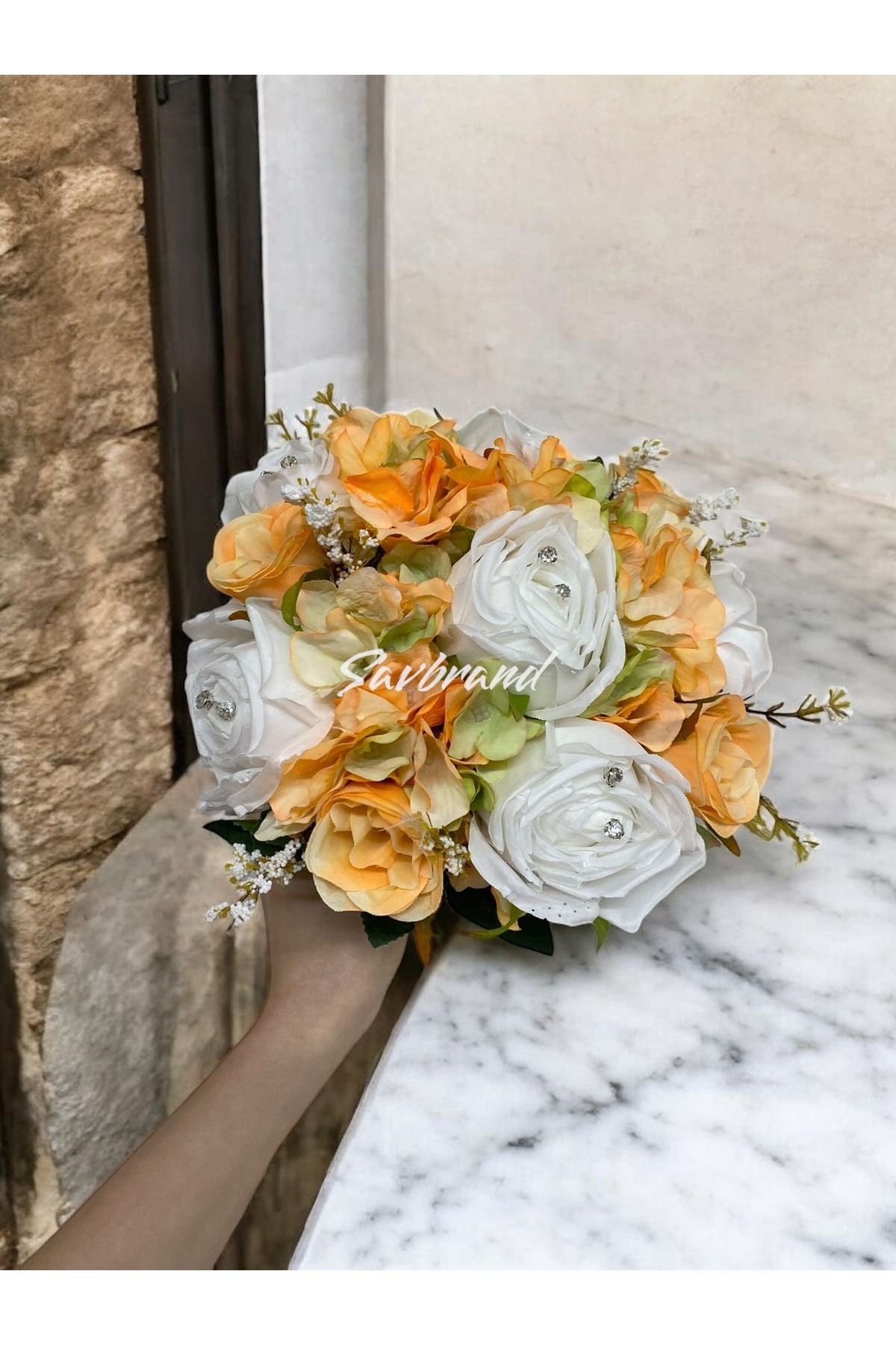 Brautstrauß aus orangefarbenen Rosen und Hortensien