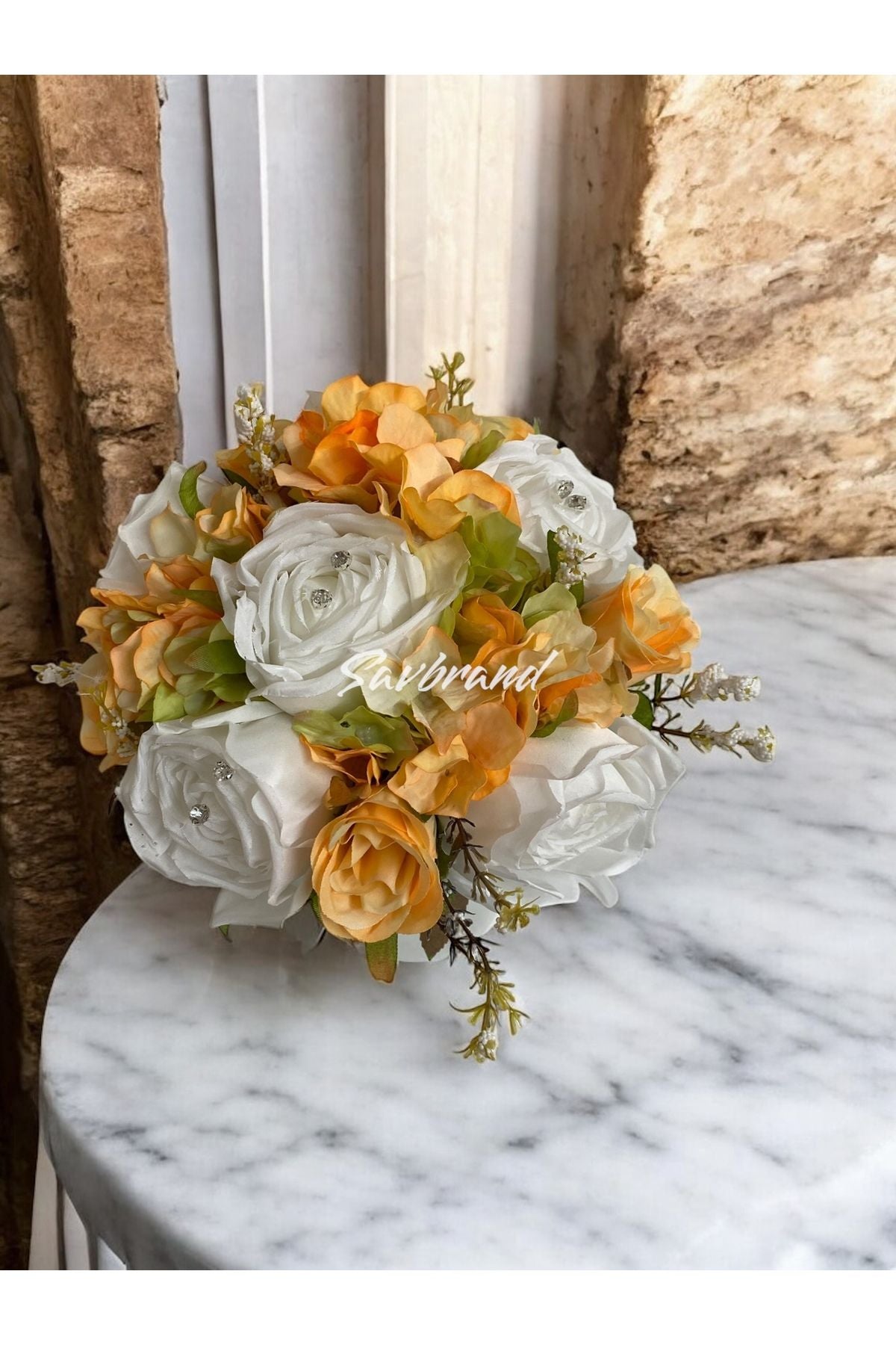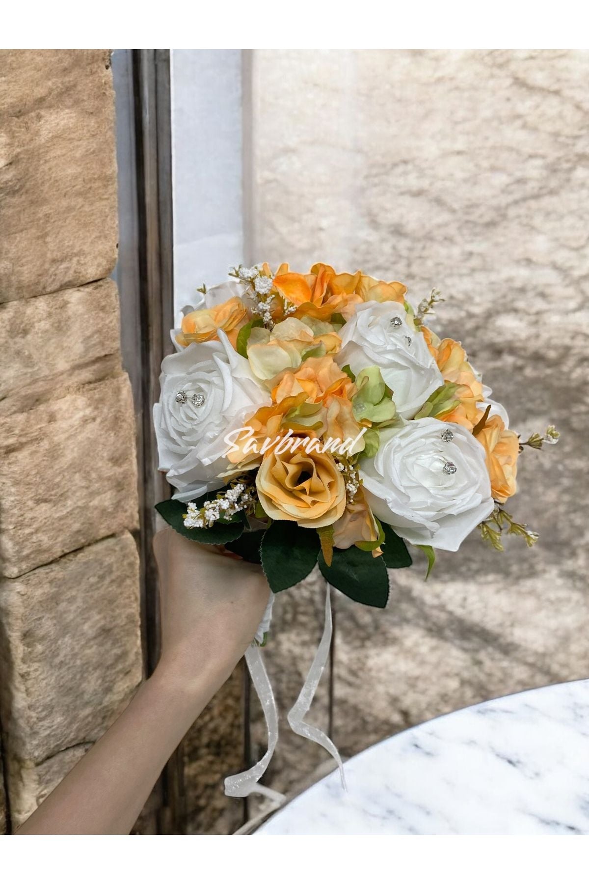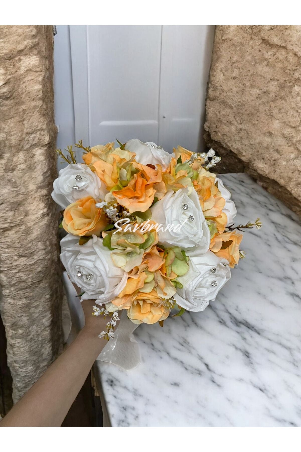 Brautstrauß aus orangefarbenen Rosen und Hortensien