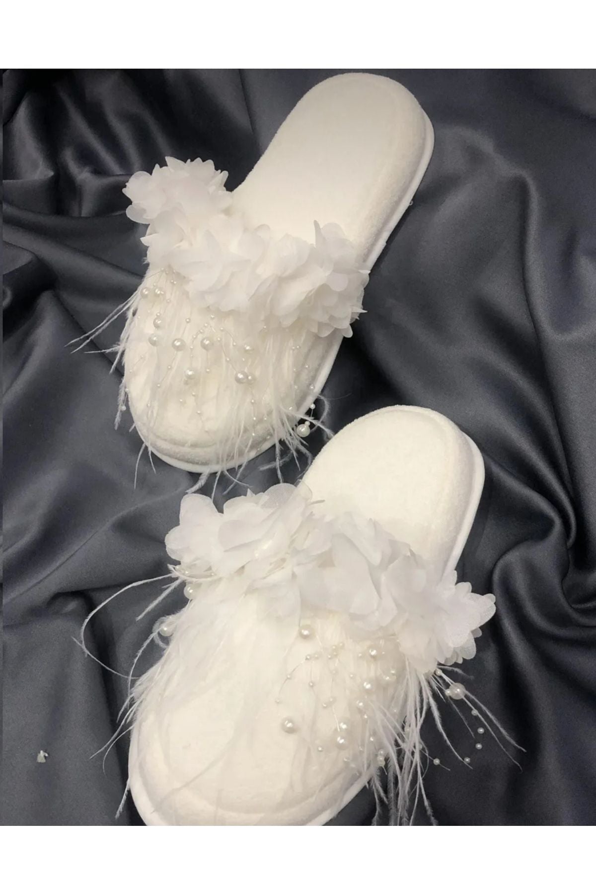 Damen Umstandspantoffeln mit Federn und Perlen und Blumenkrone, Umstandsset