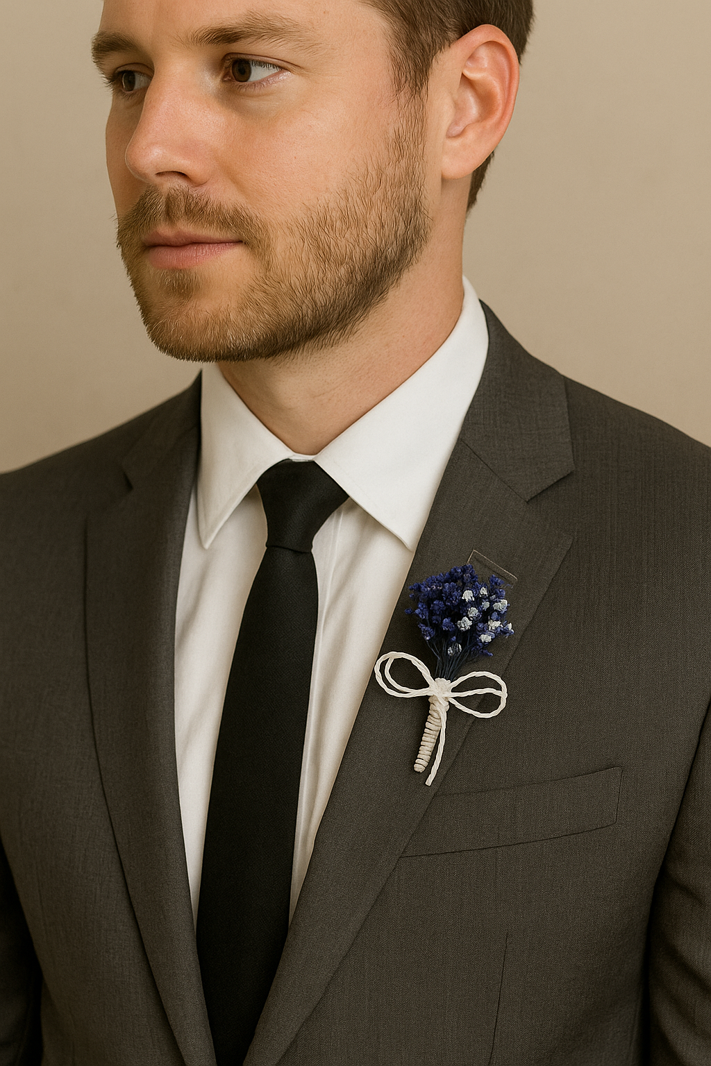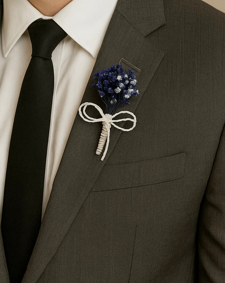 Dieses elegante Boutonniere mit natürlich wirkenden blauen Blumen verleiht Ihrem klassischen Anzug eine raffinierte Note und besticht durch seine leuchtenden Farben. Es wurde sorgfältig für Bräutigame, Trauzeugen und Herren gefertigt, die bei besonderen Anlässen Wert auf Eleganz legen.