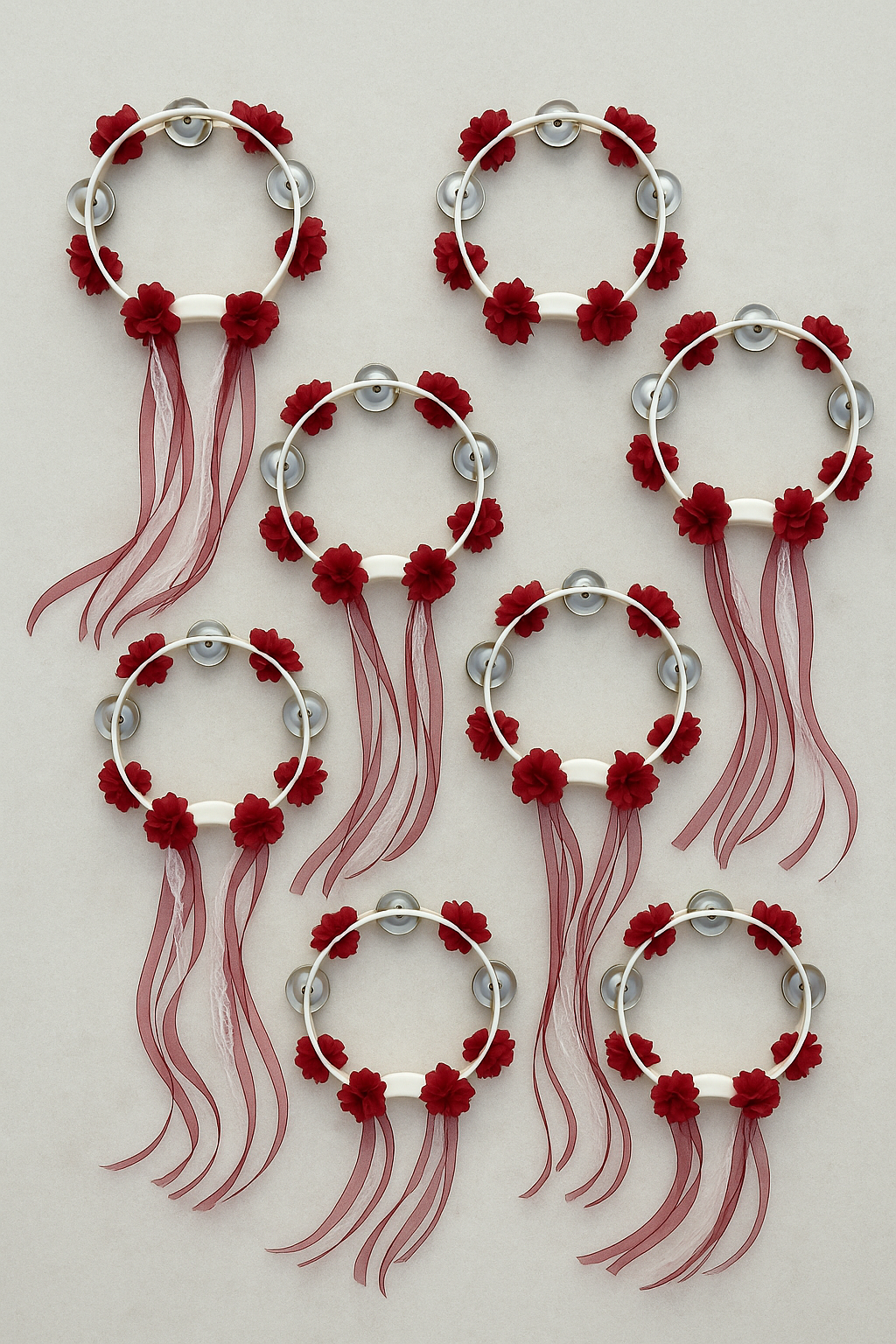 Kına gecenize gösterişli ve zarif bir dokunuş katmak için tasarlanan bordo süslü kına tefleri, üç boyutlu lazer kesim çiçekler ve uyumlu kurdele detaylarıyla dikkat çeker. Hem gelin hem de nedimeler için özel olarak hazırlanmıştır. Geleneksel kına eğlencelerini modern detaylarla buluşturan bu set, danslarınızı daha da göz alıcı hale getirir.