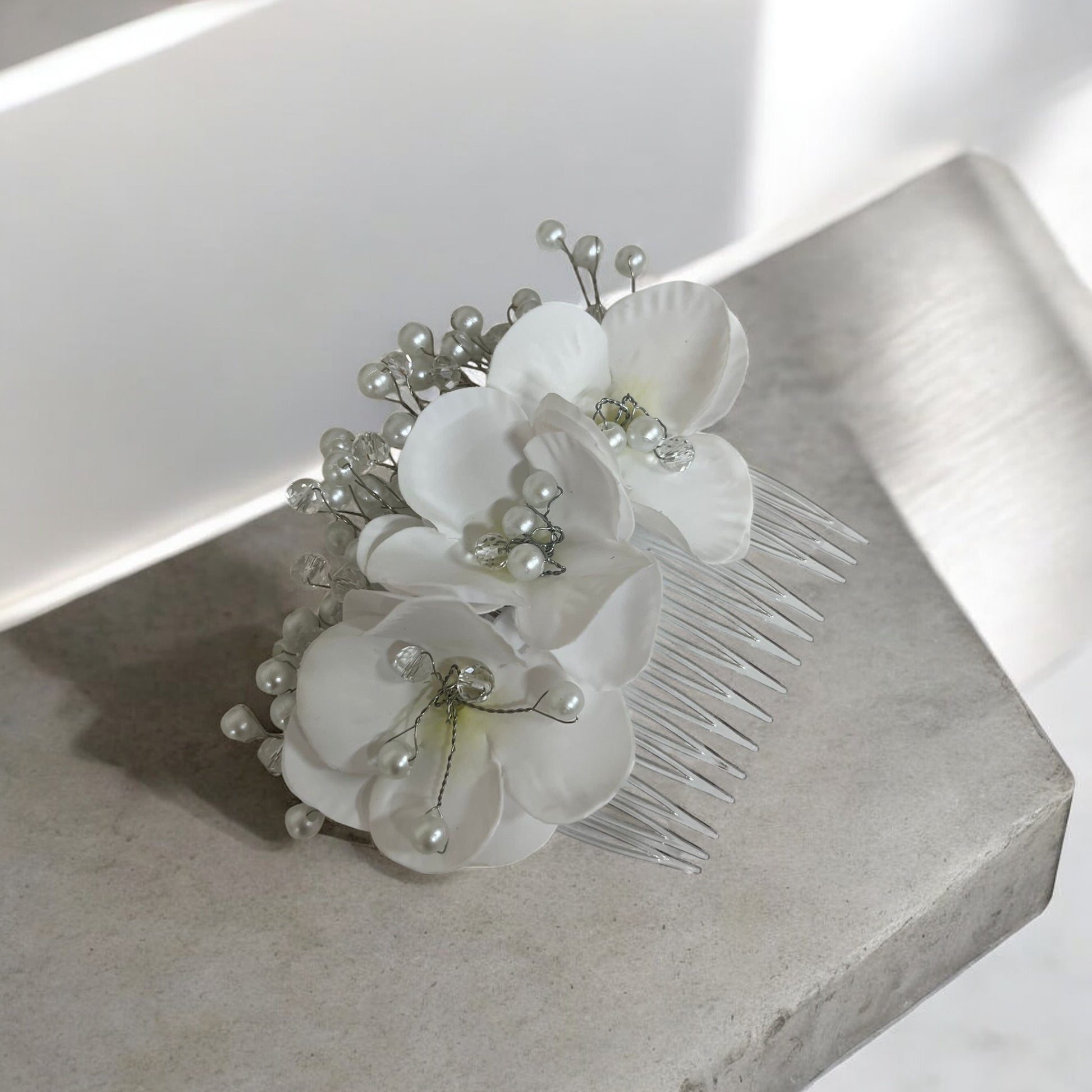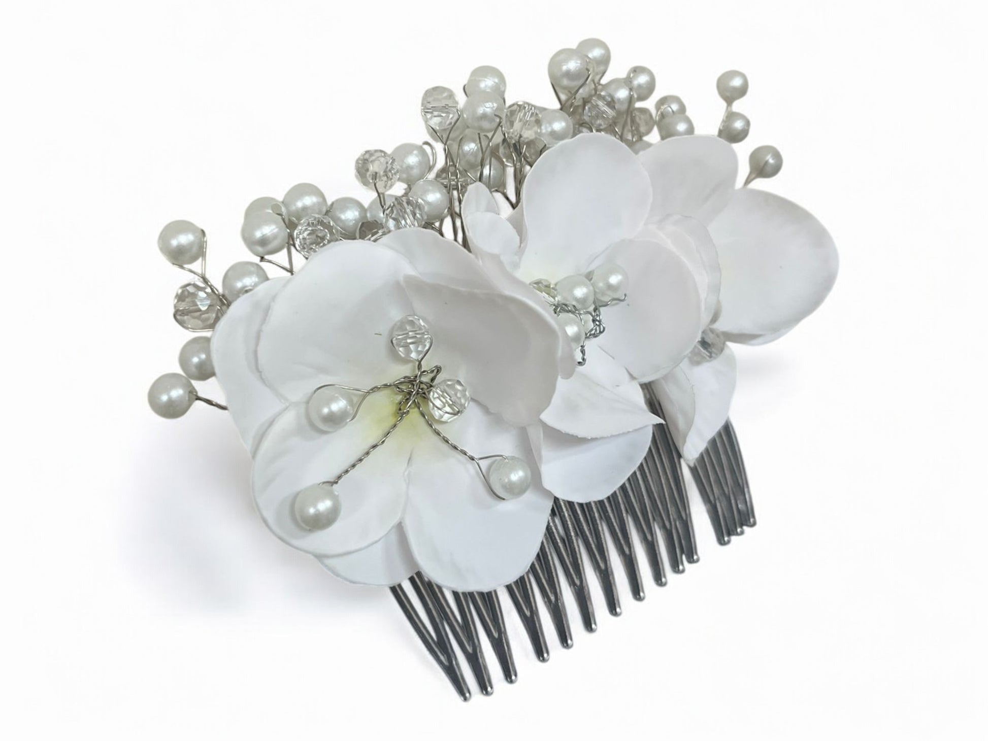 Beyaz Çiçek Desenli Kristal Gelin Tokası – El Yapımı Zarif Saç Aksesuarı