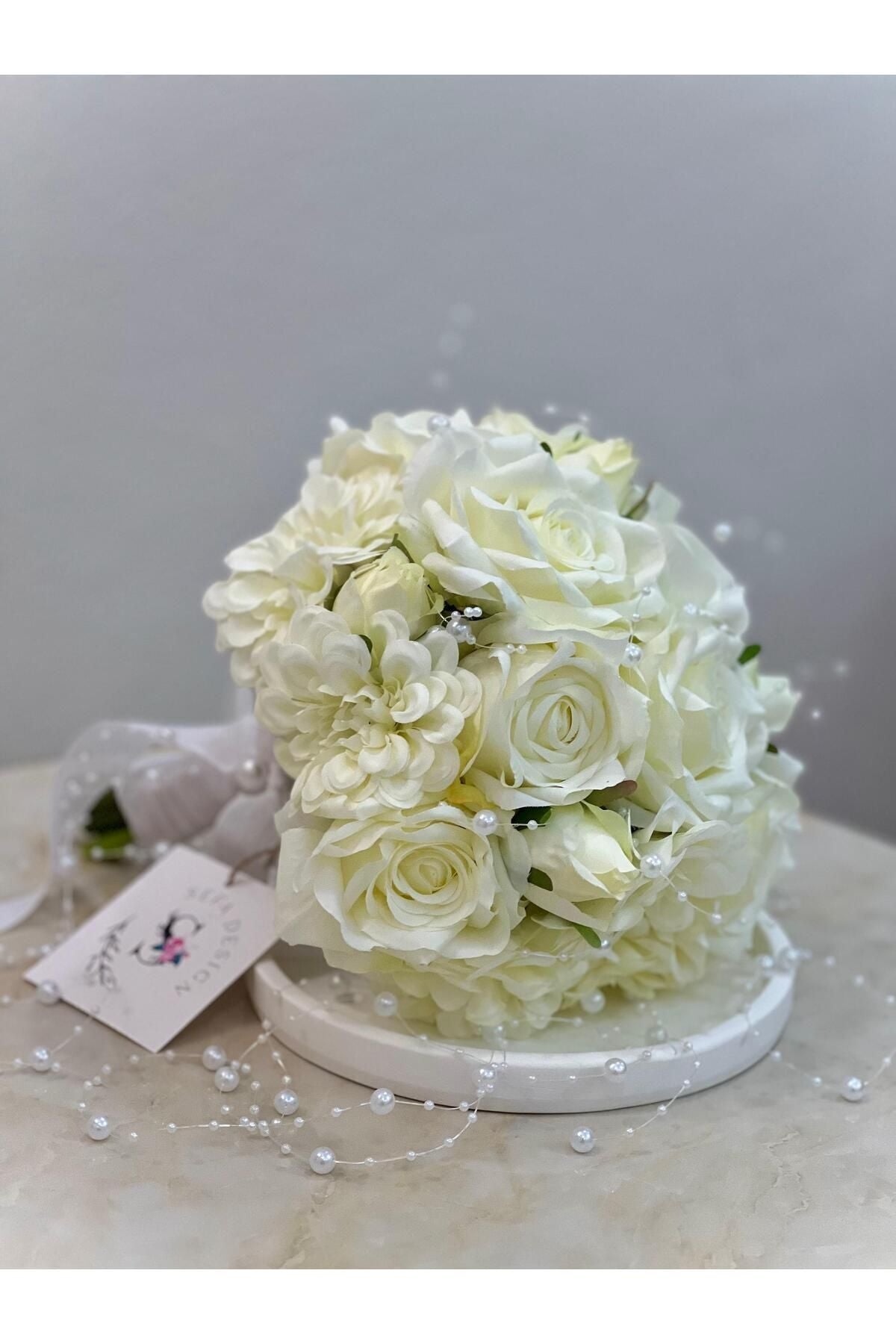 Sefa Design\'den Beyaz İncili Gül Gelin Buketi - Damat Yaka Çiçeği 2\'li Set