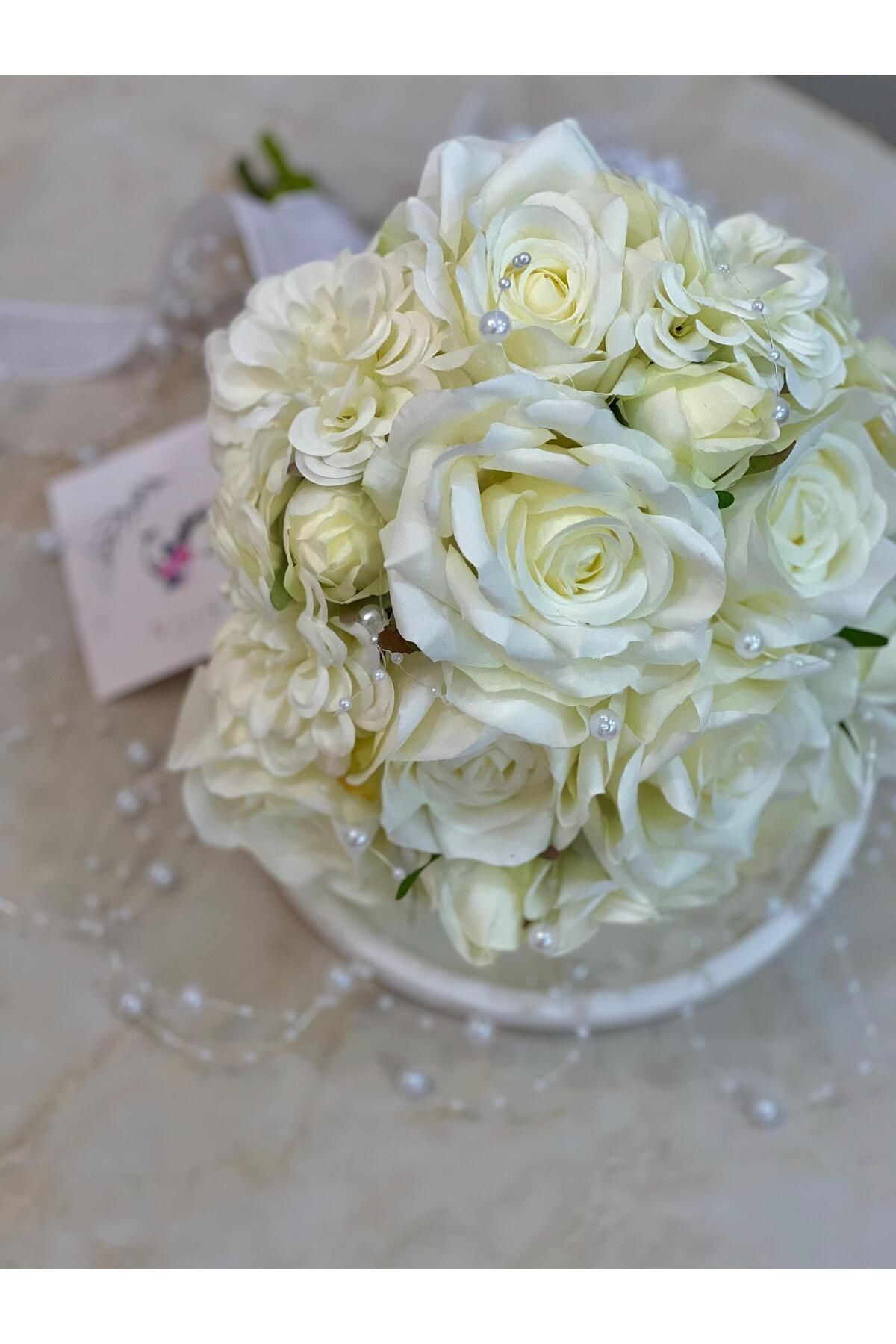 Beyaz İncili Gül Gelin Buketi - Damat Yaka Çiçeği