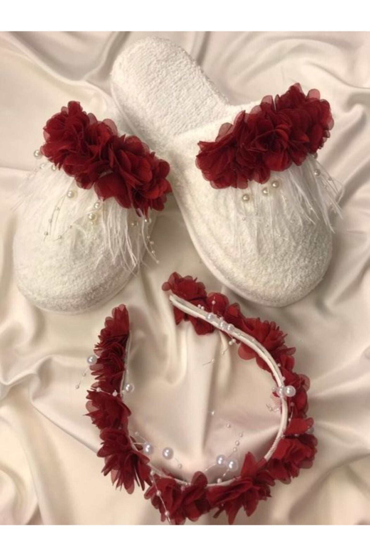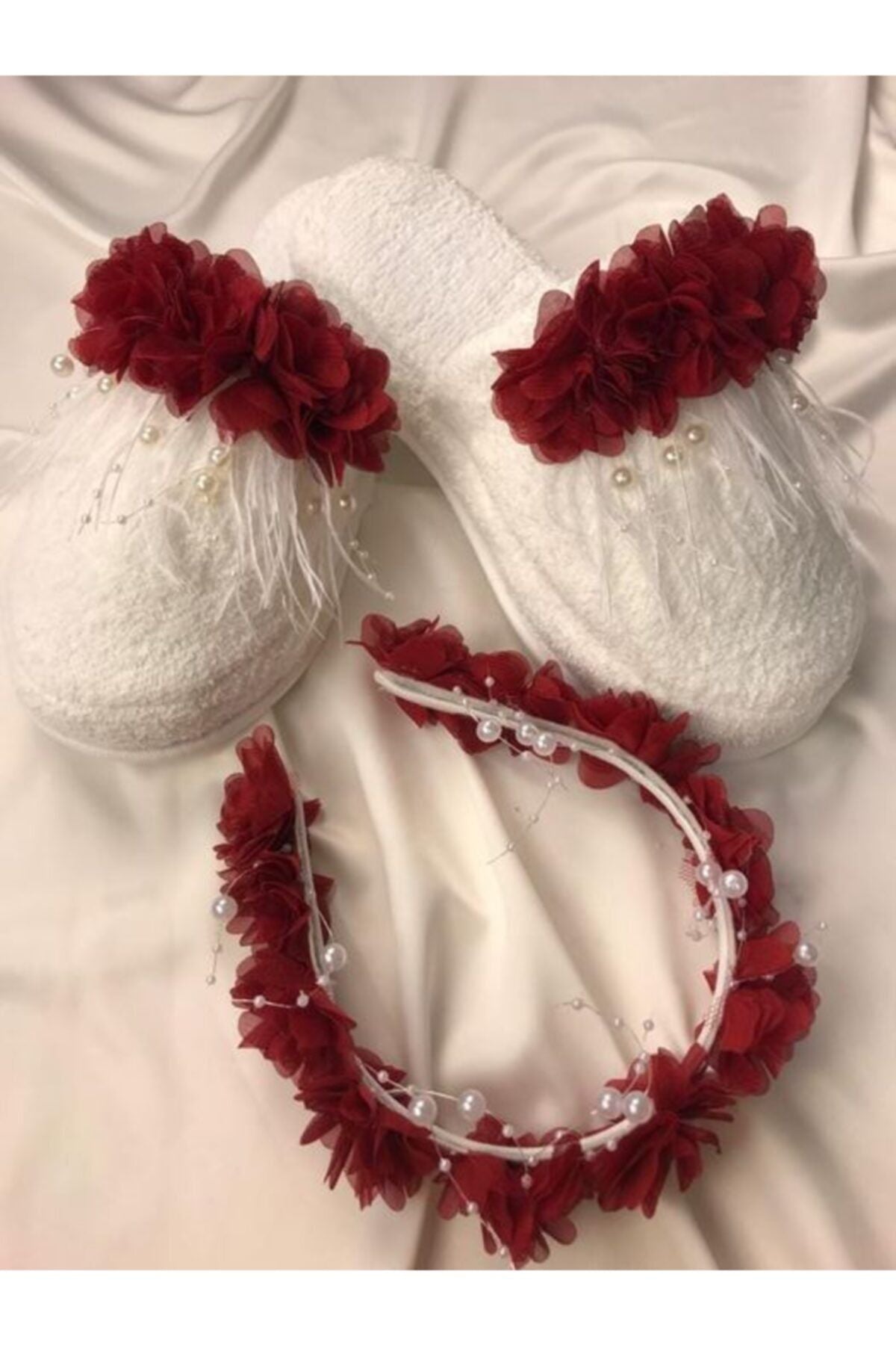 Beyaz Incili Bordo Çiçek Süslemeli Lohusa Terlik Taç Takımı