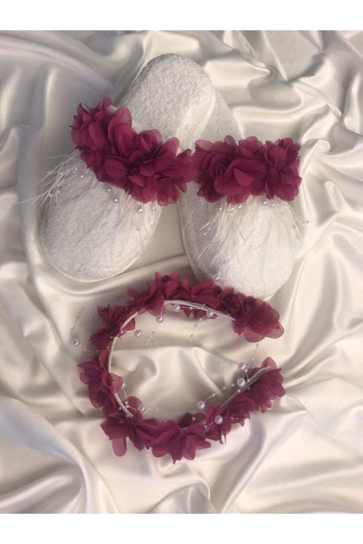 Beyaz Incili Mürdüm Çiçek Süslemeli Lohusa Terlik Taç Takımı