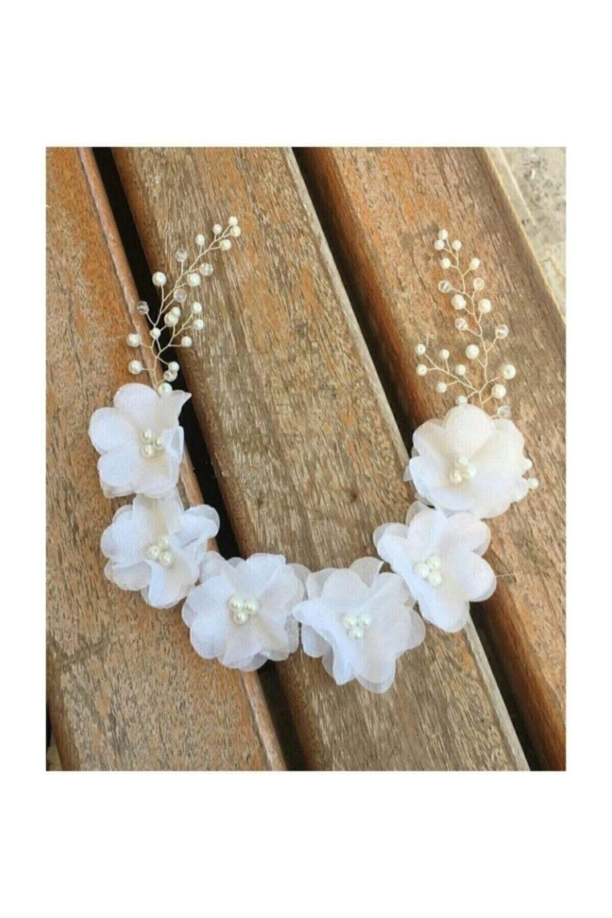 Beyaz Şifon Çiçekli 4 Yapraklı Incili Gelin Tacı Cyf29