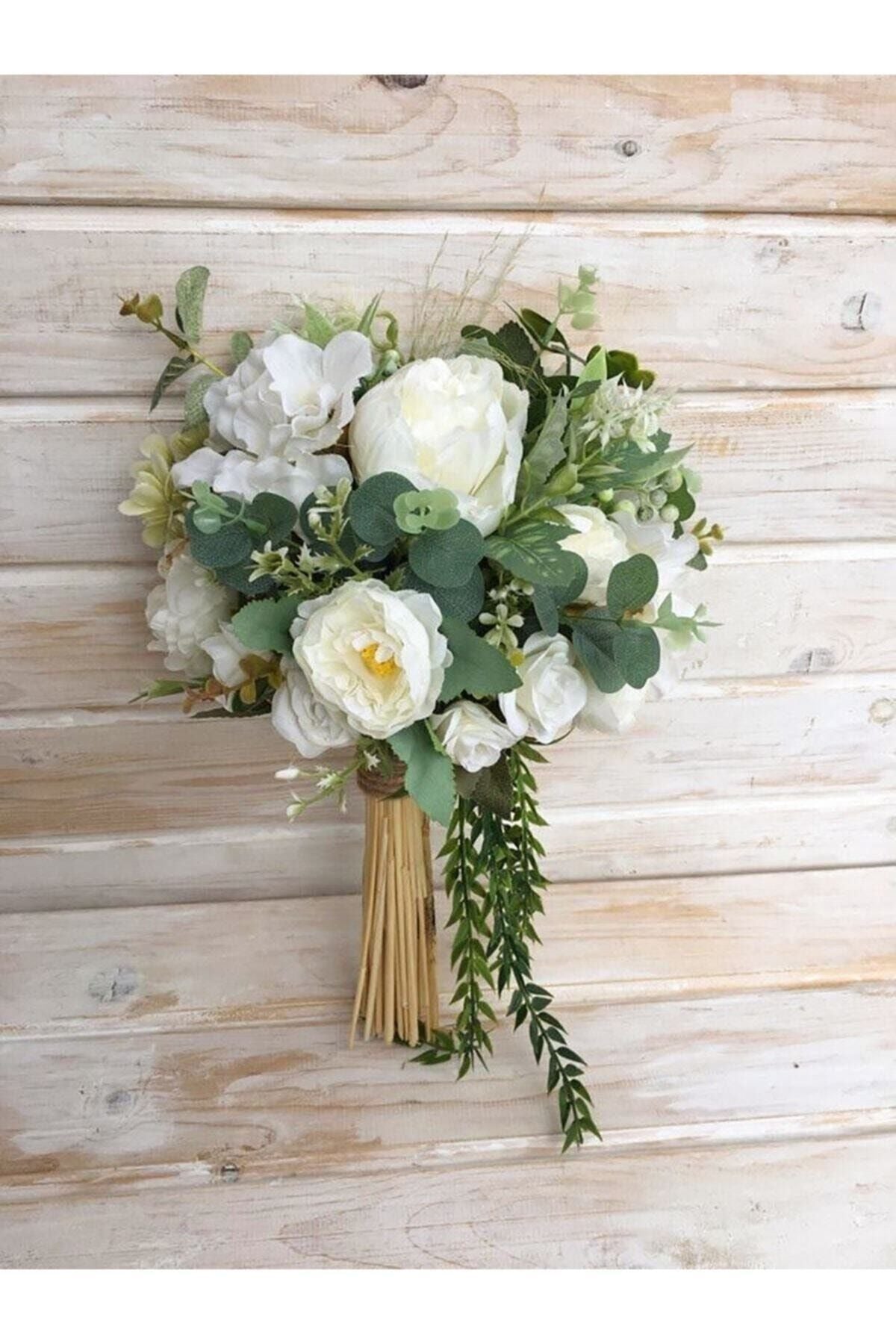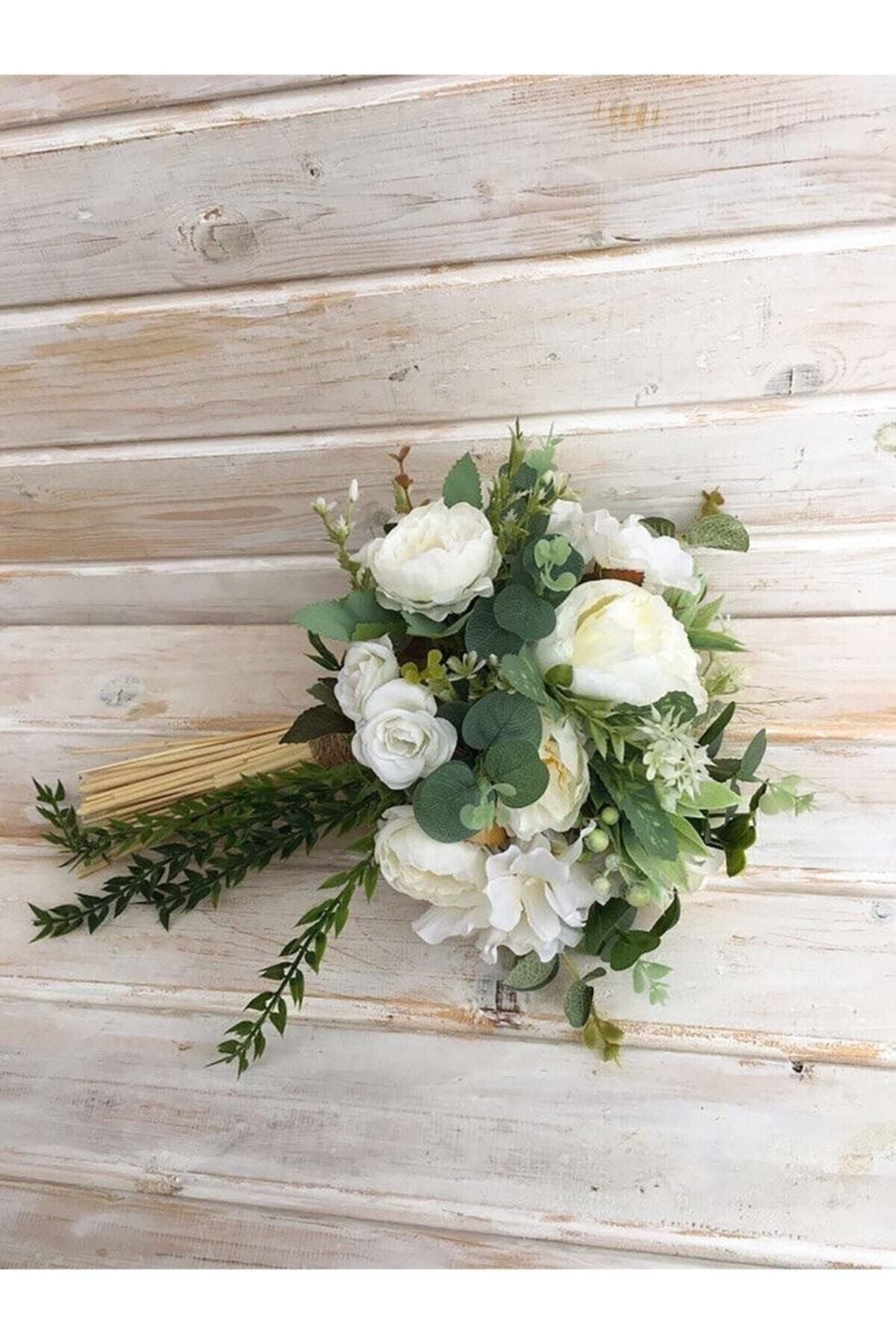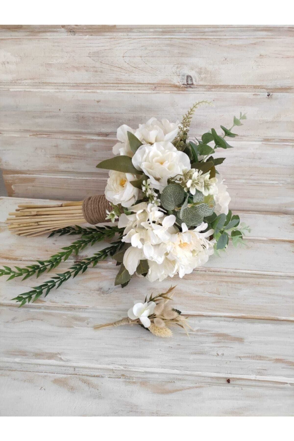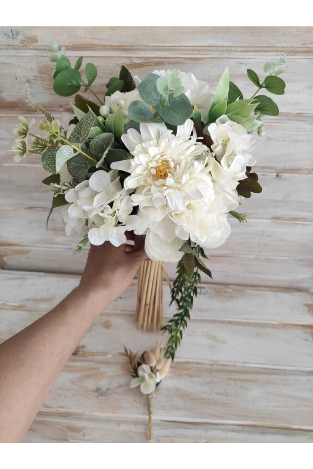 Beyaz Ve Yeşil Tonlarda Gelin El Buketi Ve Damat Yaka Çiçeği