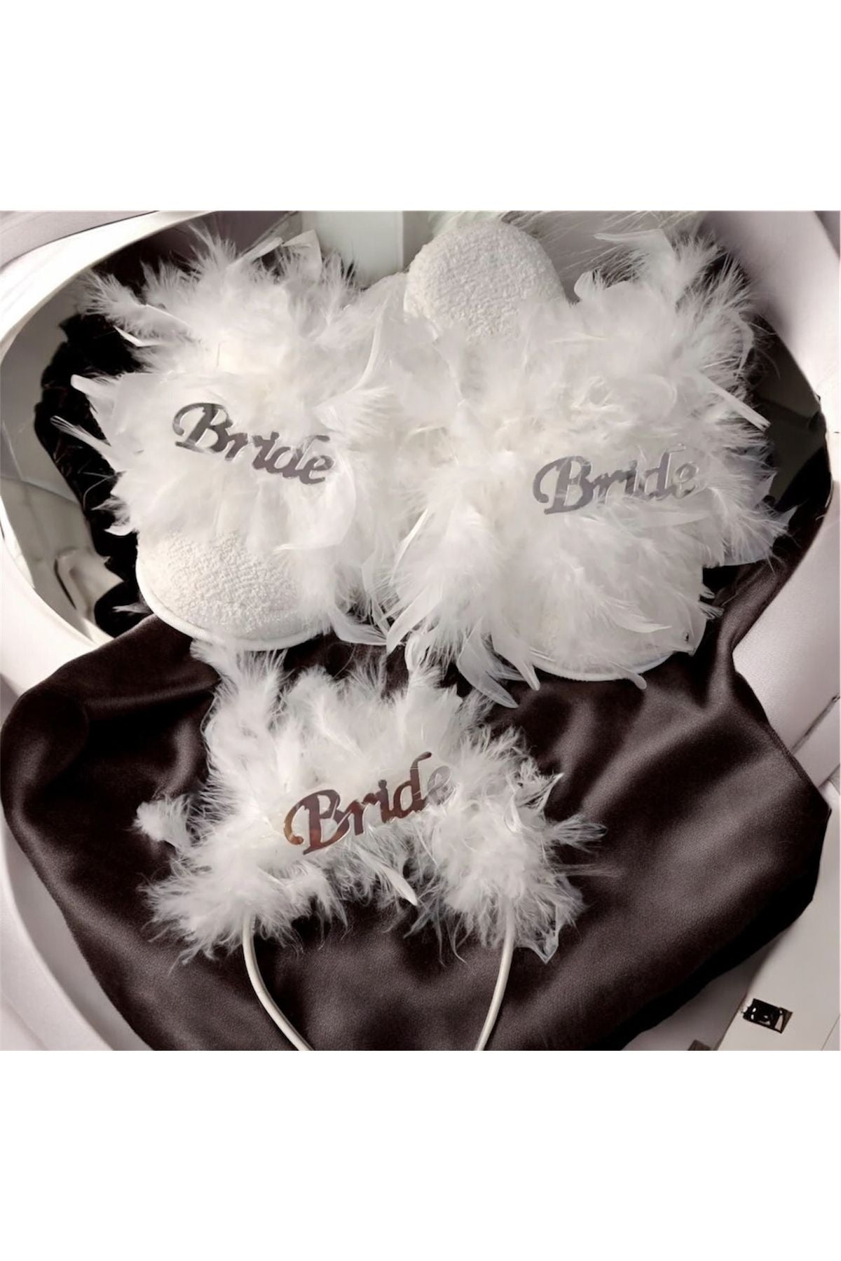 Bride Beyaz Tüylü Gelin Terliği ve Tacı, Tüylü Lohusa Terliği ve Tacı