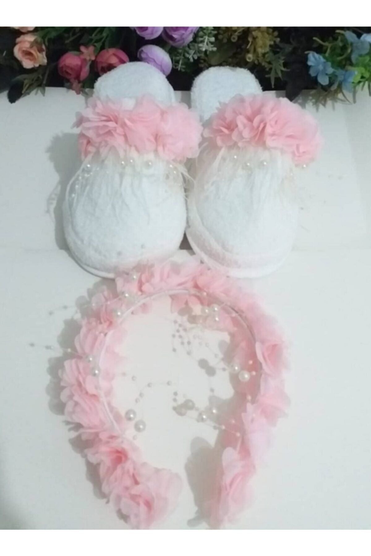 İncili Çiçek Süslemeli Lohusa Terlik Taç Takımı 1000