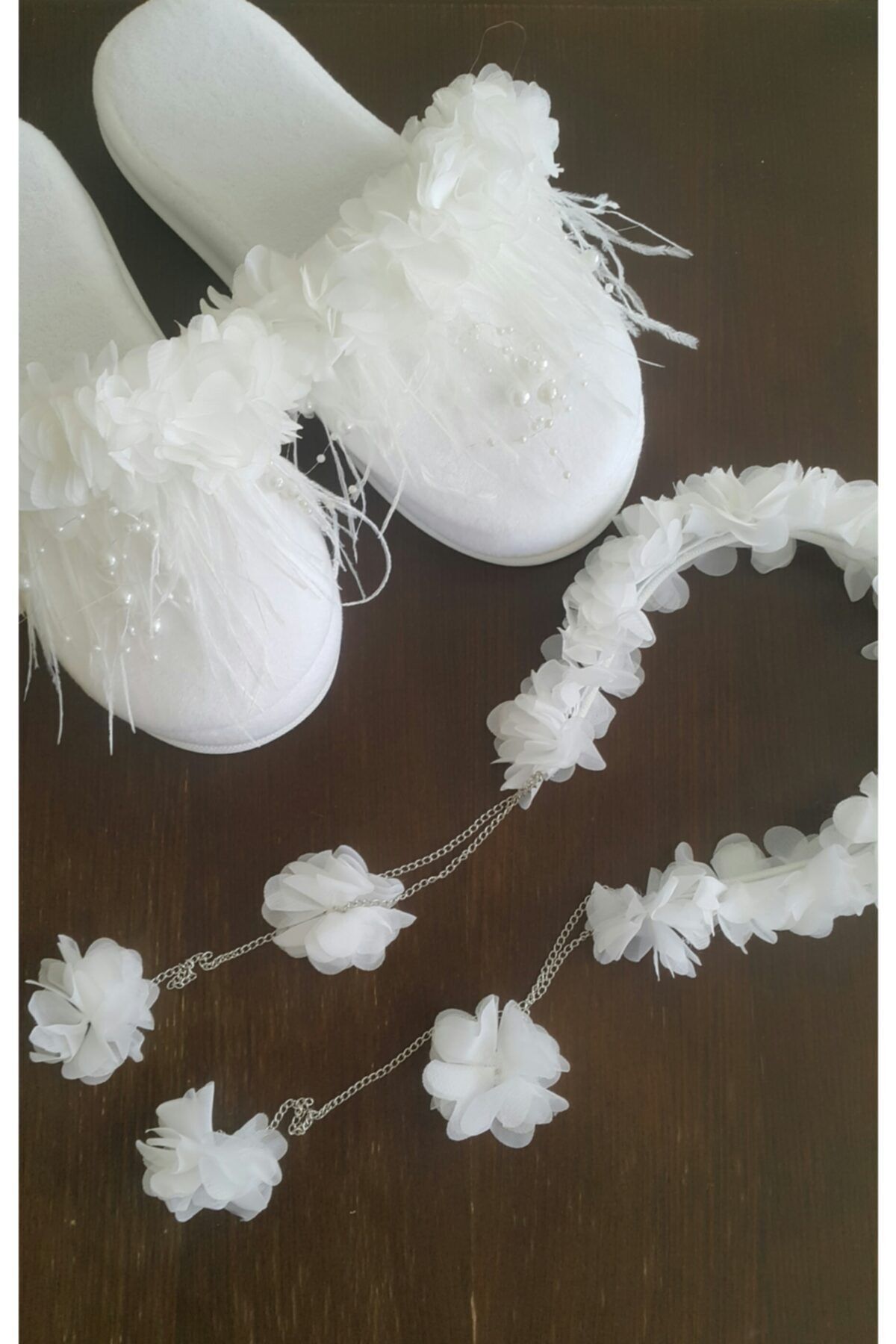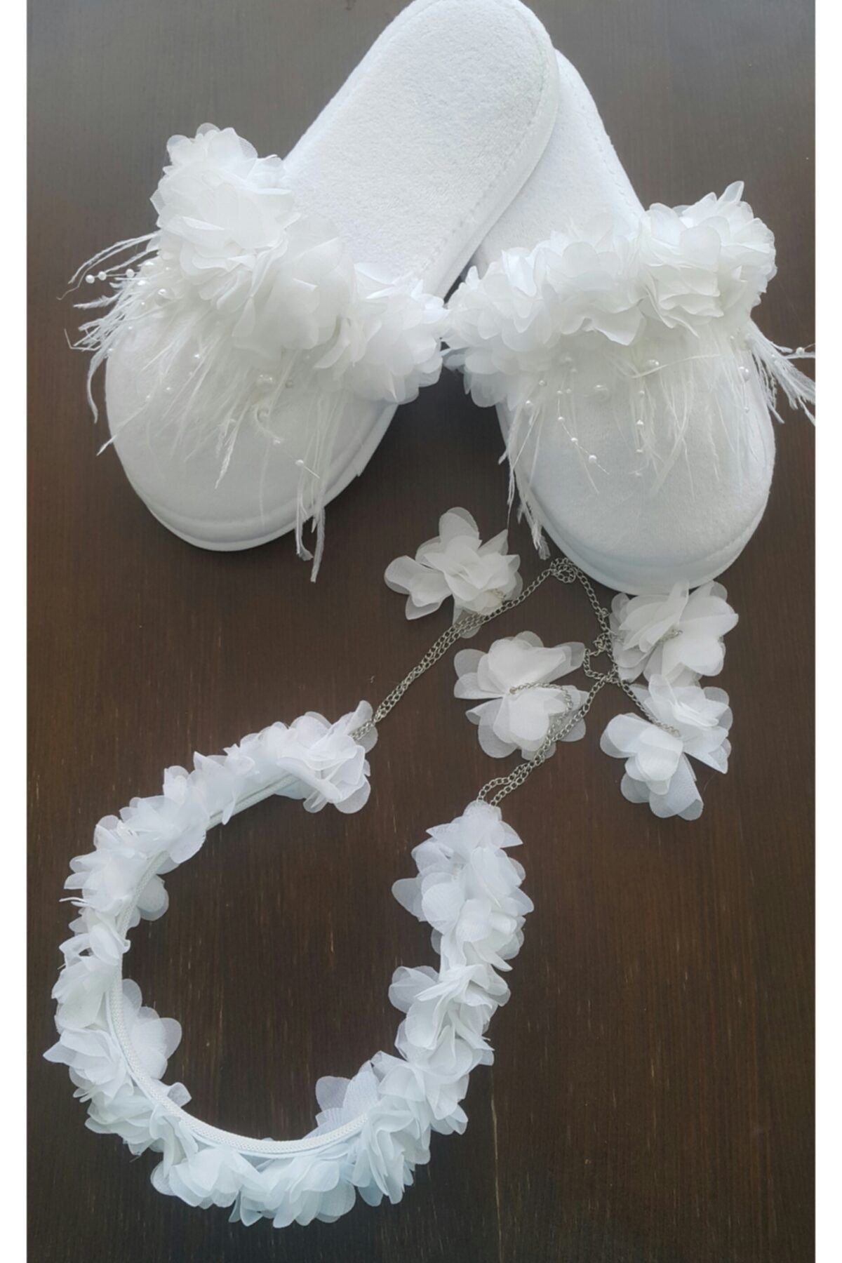 Kadın Beyaz Taç Terlik Sallamalı Küpeli Lohusa Seti