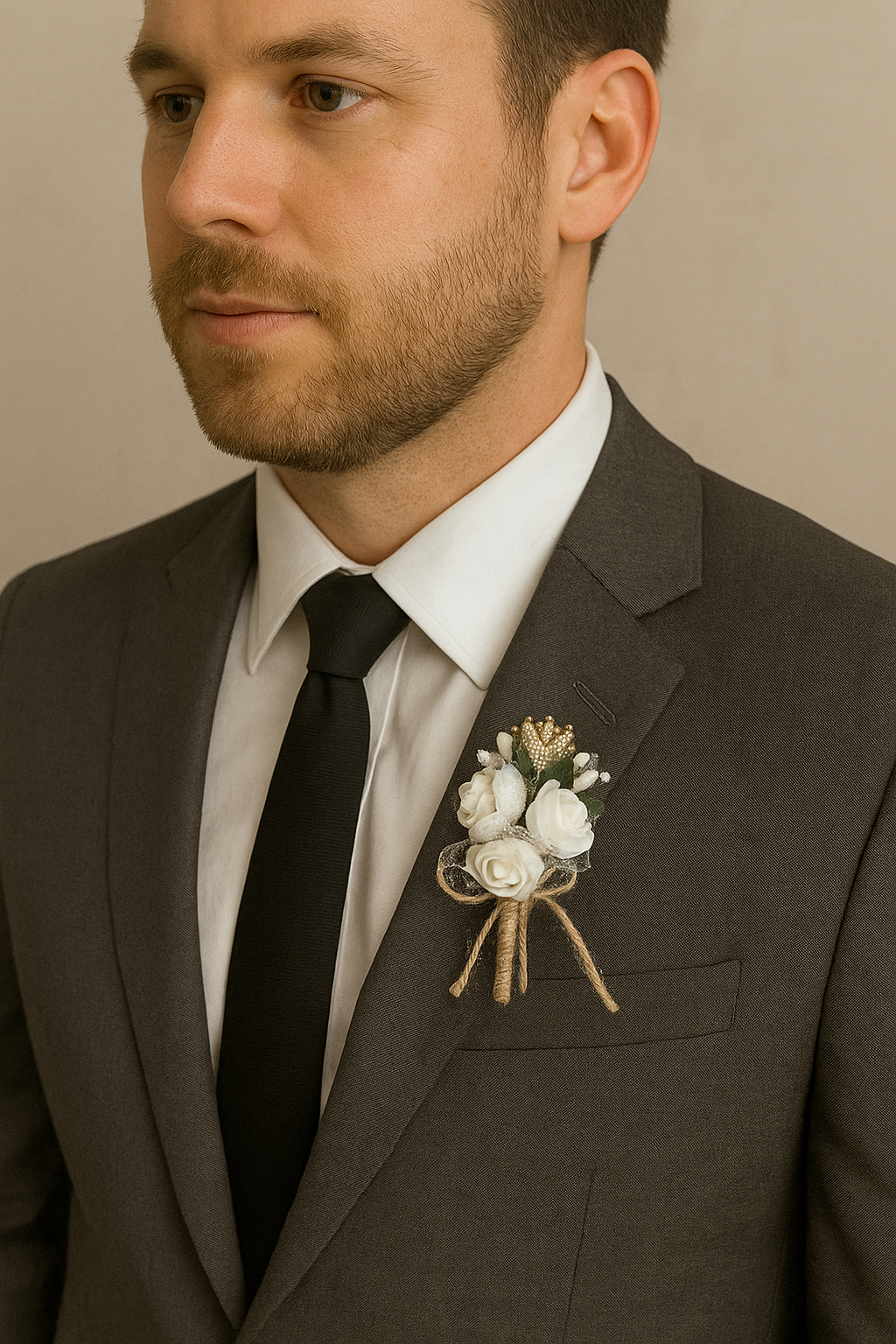 Bembeyaz güllerle tasarlanan bu şık yaka çiçeği, damatlığınıza asil bir dokunuş katar. El yapımı detayları ve gerçekçi çiçek dokusuyla hem klasik hem de modern kombinlerle mükemmel uyum sağlar.