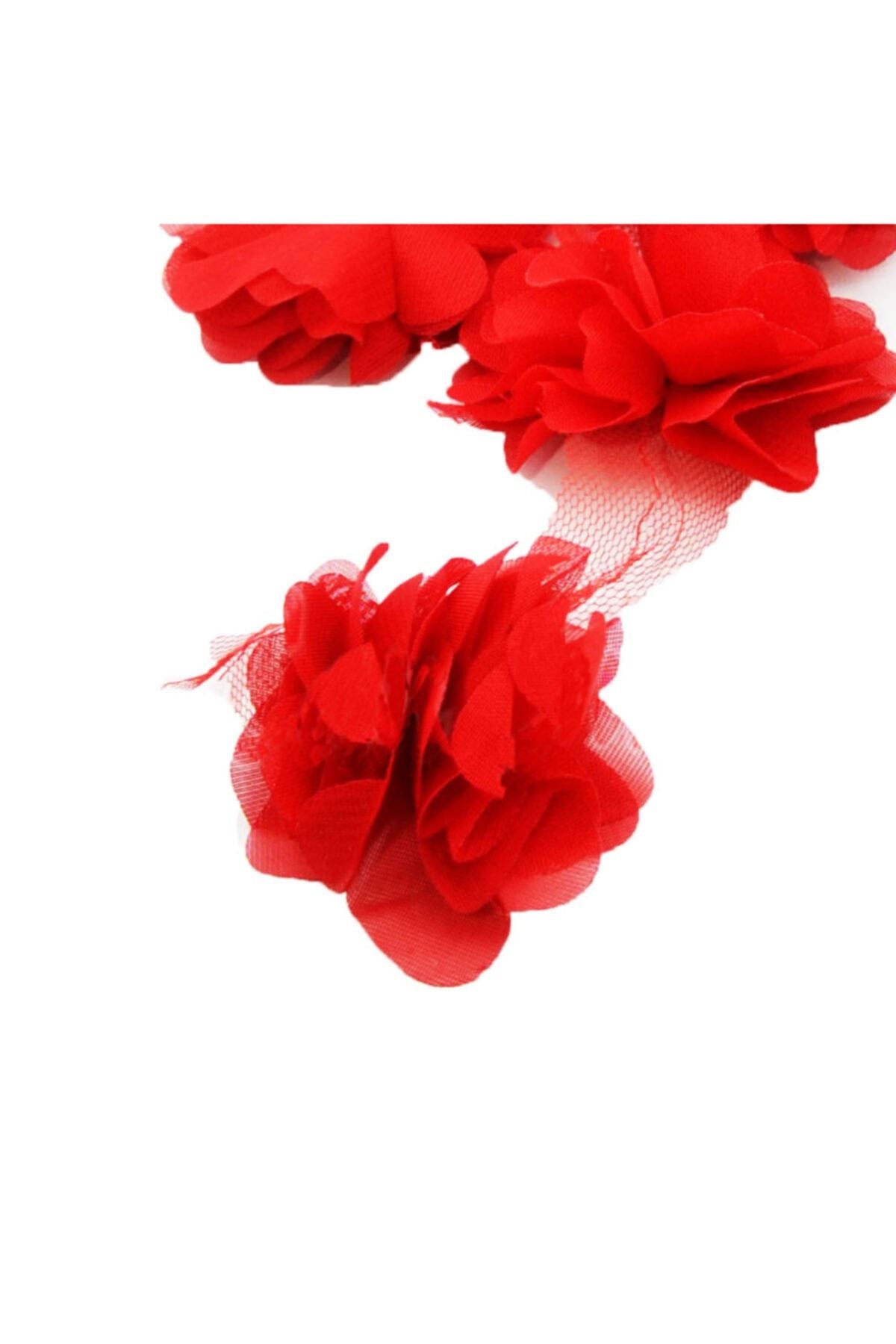 Kırmızı 1m Gül Lazer Kesim Çiçek 12-13 Adet Organze Tül Kenar Süsü Tekstil Tasarım Kumaşı Yapay Süs