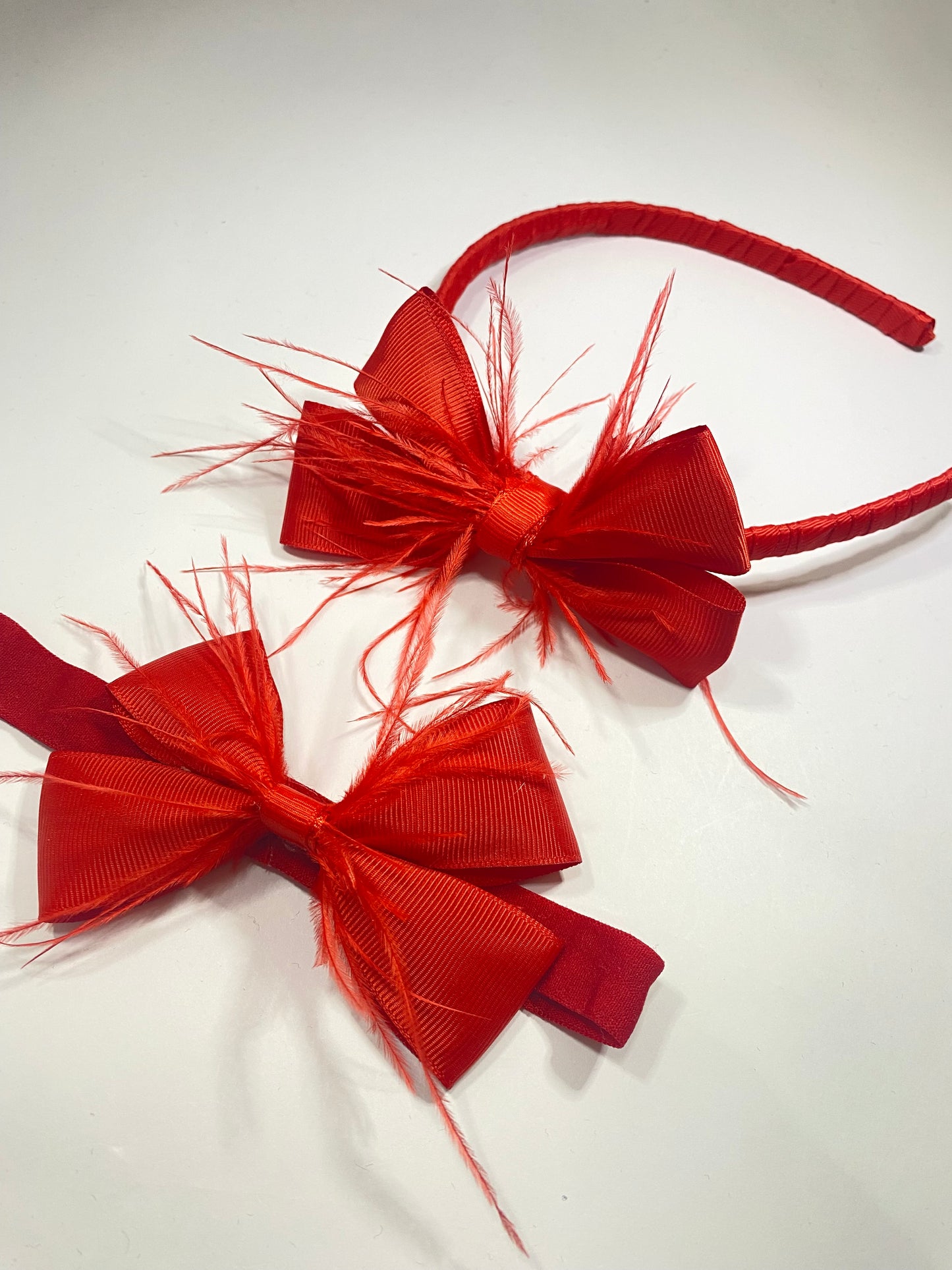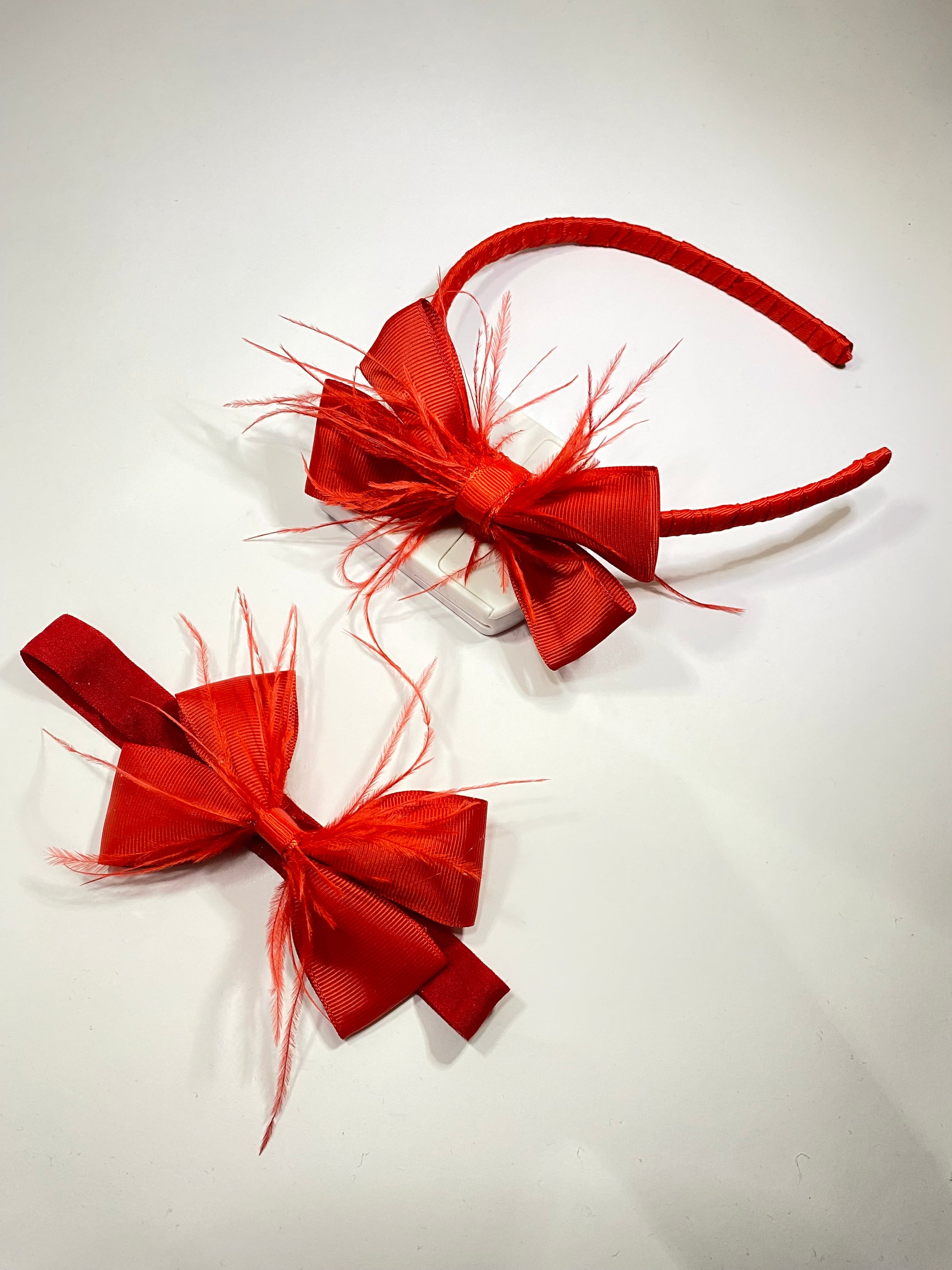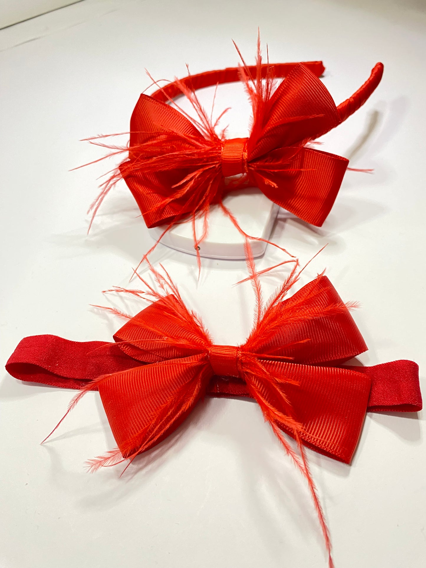 Kırmızı fiyonk detaylı anne tacı ve onunla uyumlu kırmızı fiyonklu bebek bandanası, doğum sonrası hastane ziyaretlerinde, fotoğraf çekimlerinde ya da baby shower organizasyonlarında hem şık hem de sevimli bir görünüm sunar.