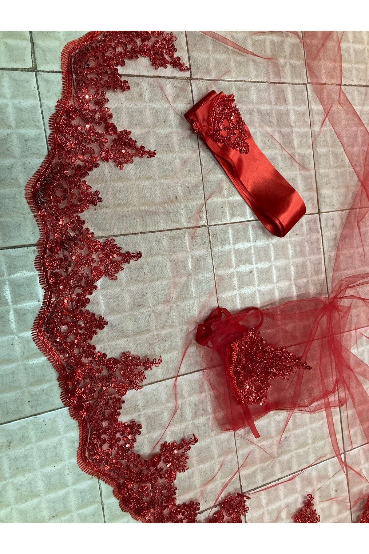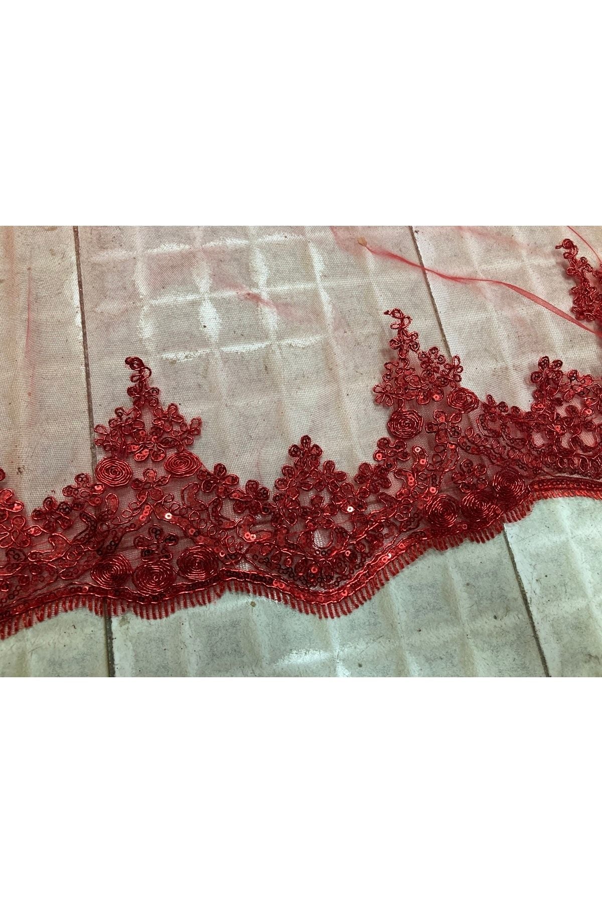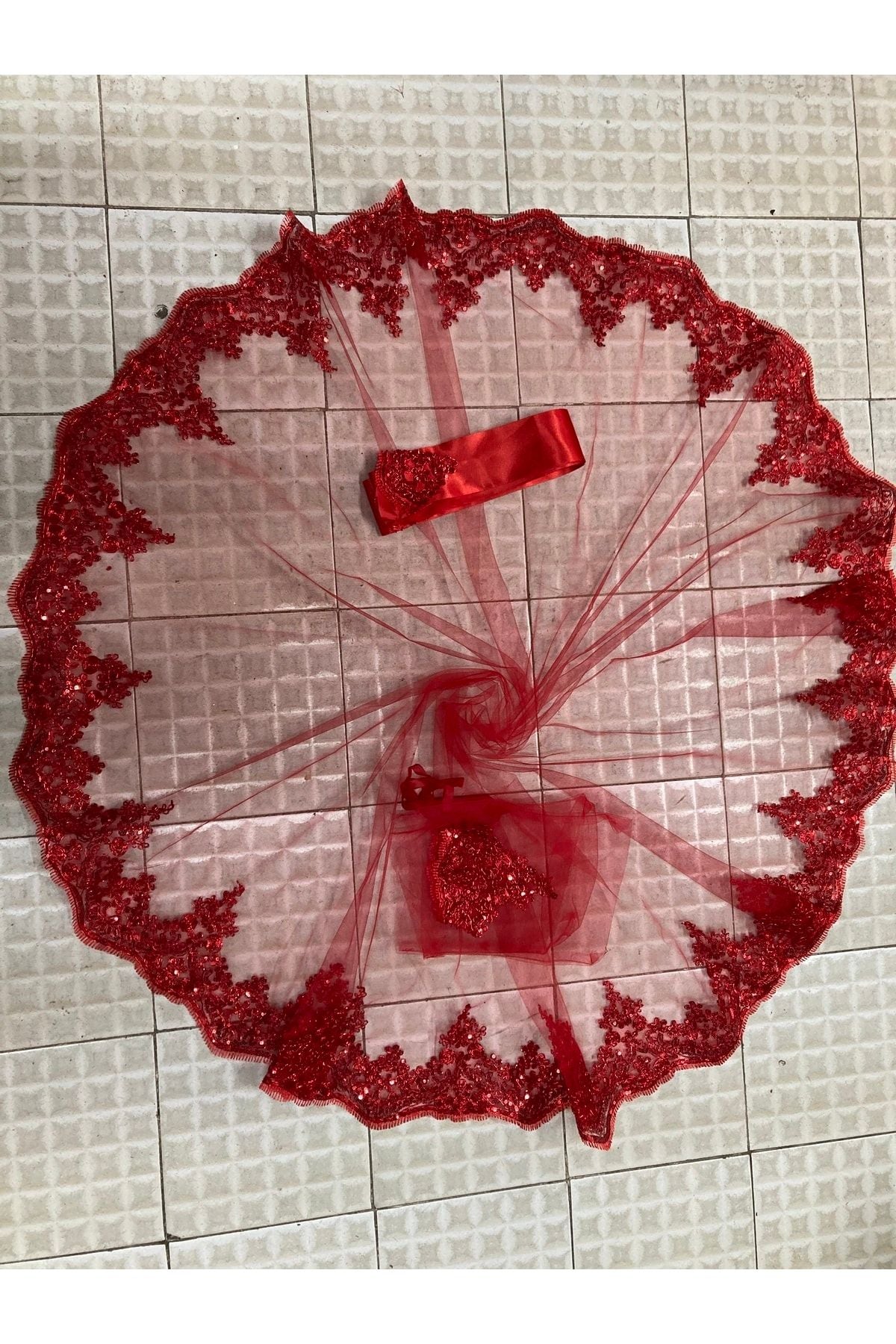 Kırmızı Pullu Parlak Güpürlü Kına Örtüsü Duvak