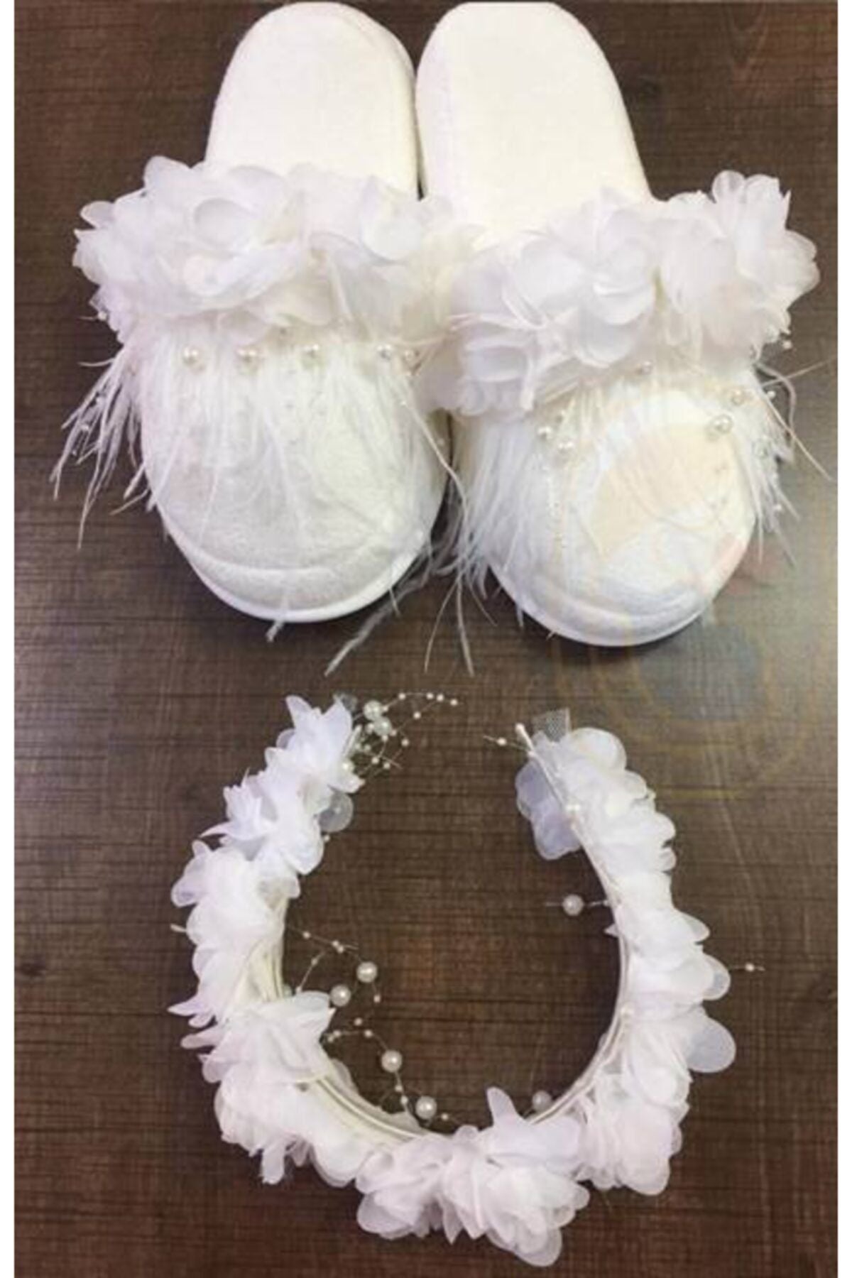Lohusa Beyaz İncili Beyaz Çiçek Süslemeli Lohusa Terlik Taç Takımı 2023