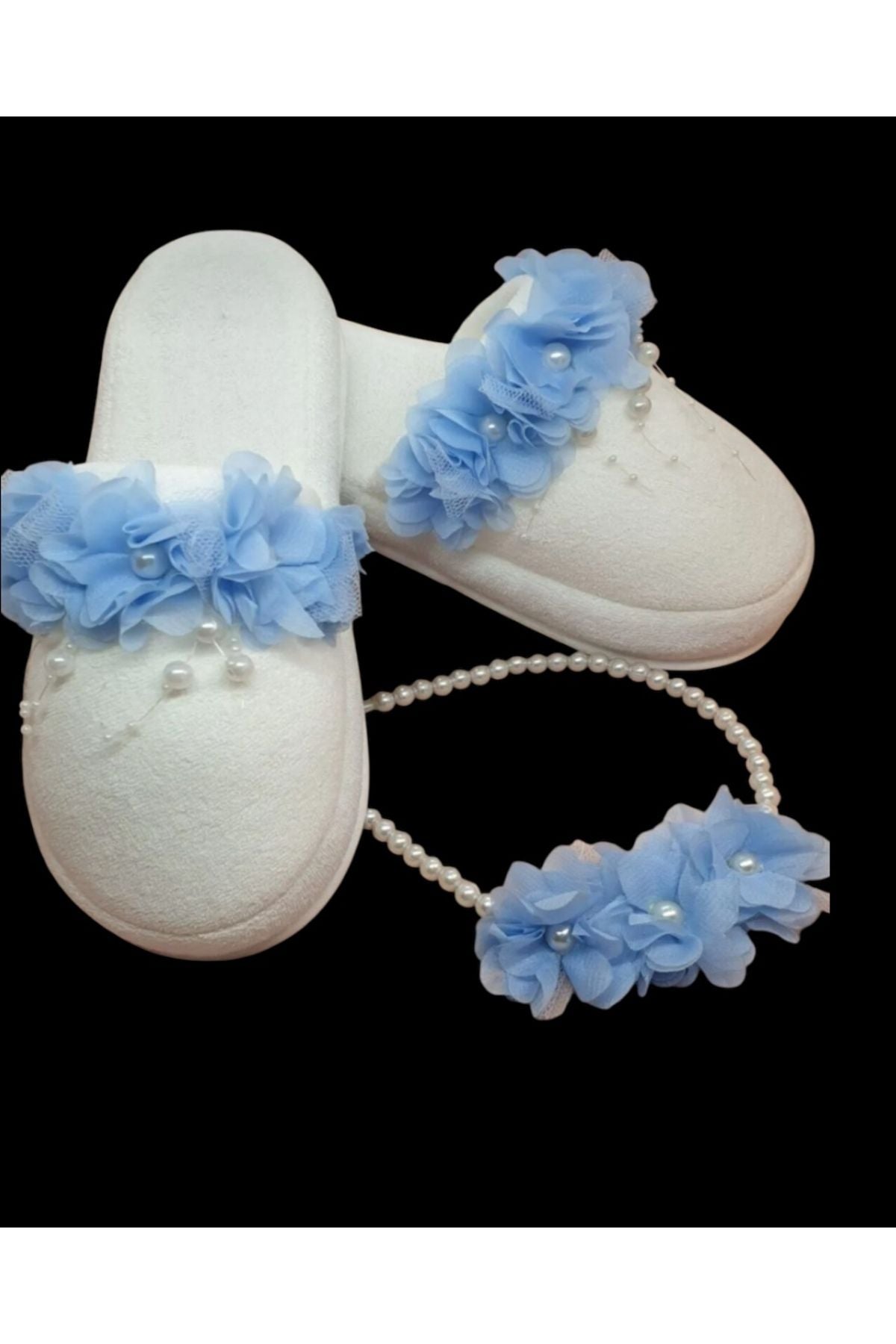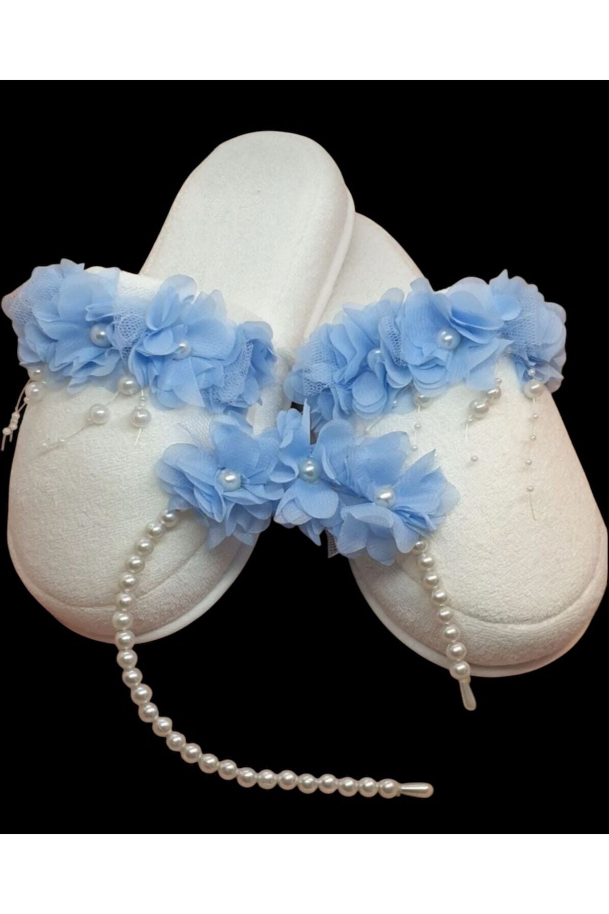 Mavi Çiçek ve İnci Detaylı Lohusa Terlik-Taç Seti | Özel Günlere Özel Tasarım