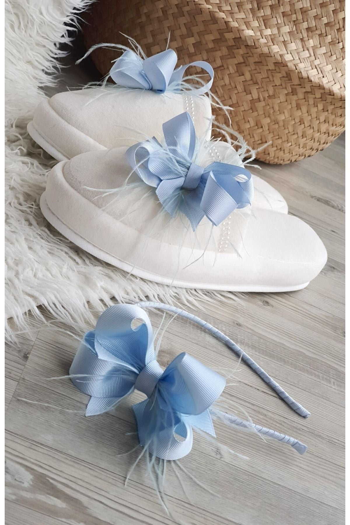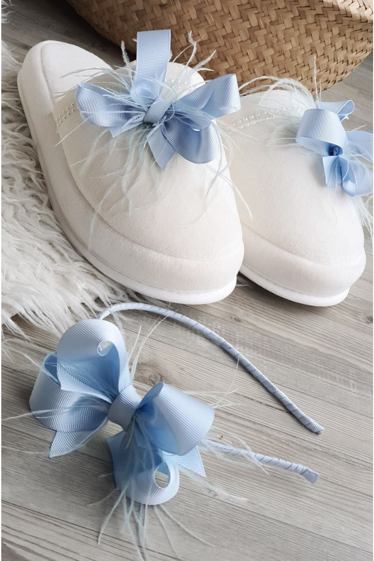 Mavi Fiyonklu Tüylü Anne Lohusa Terlik Taç Lohusa Seti