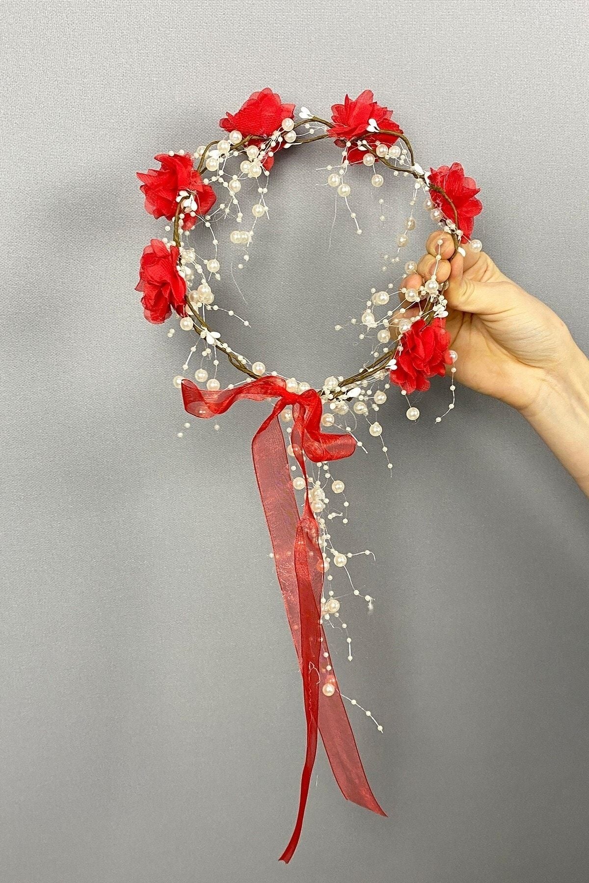 Nedime Tacı Kırmızı Lazer Çiçekli Incili Özel Tasarım Nedime Tacı Dış Çekim Tacı