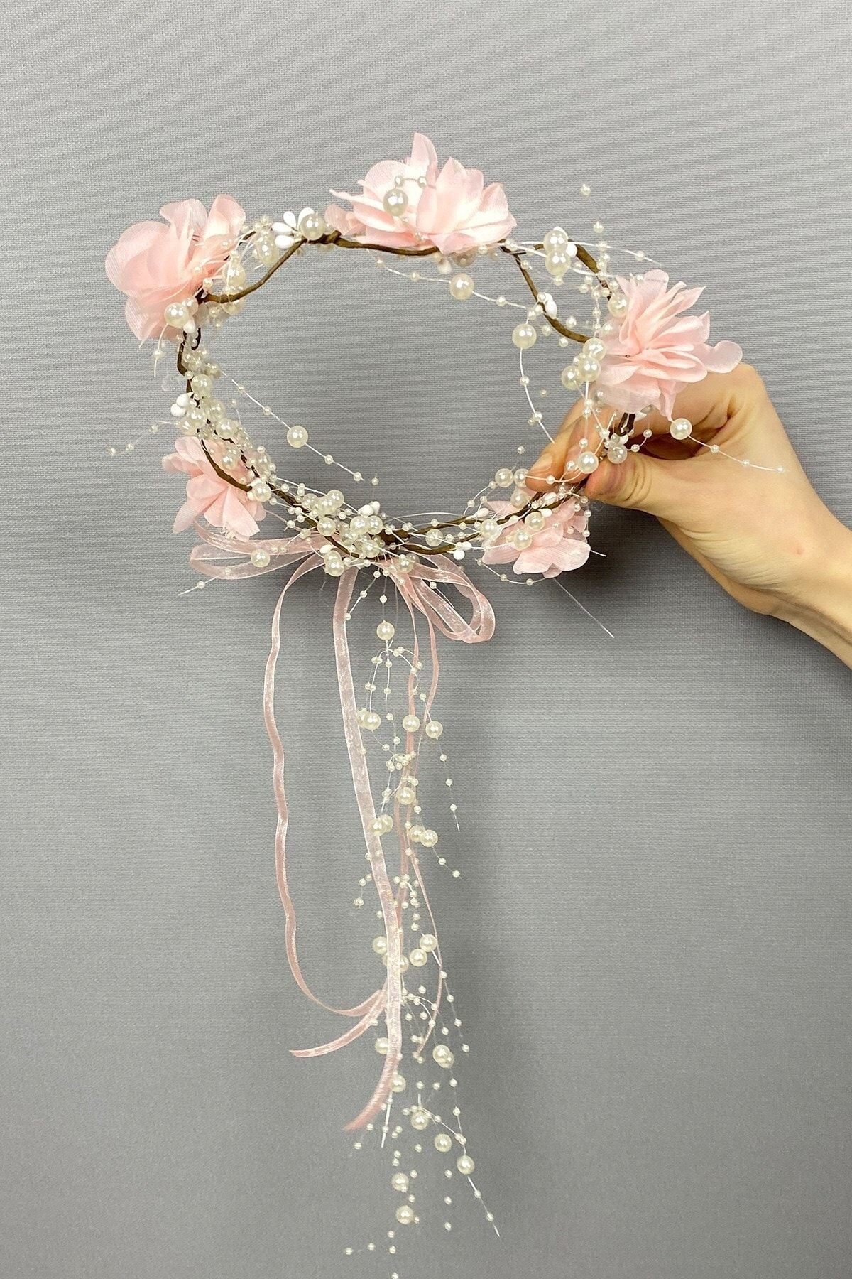 Nedime Tacı Pudra Lazer Çiçekli Incili Özel Tasarım Nedime Tacı Dış Çekim Tacı