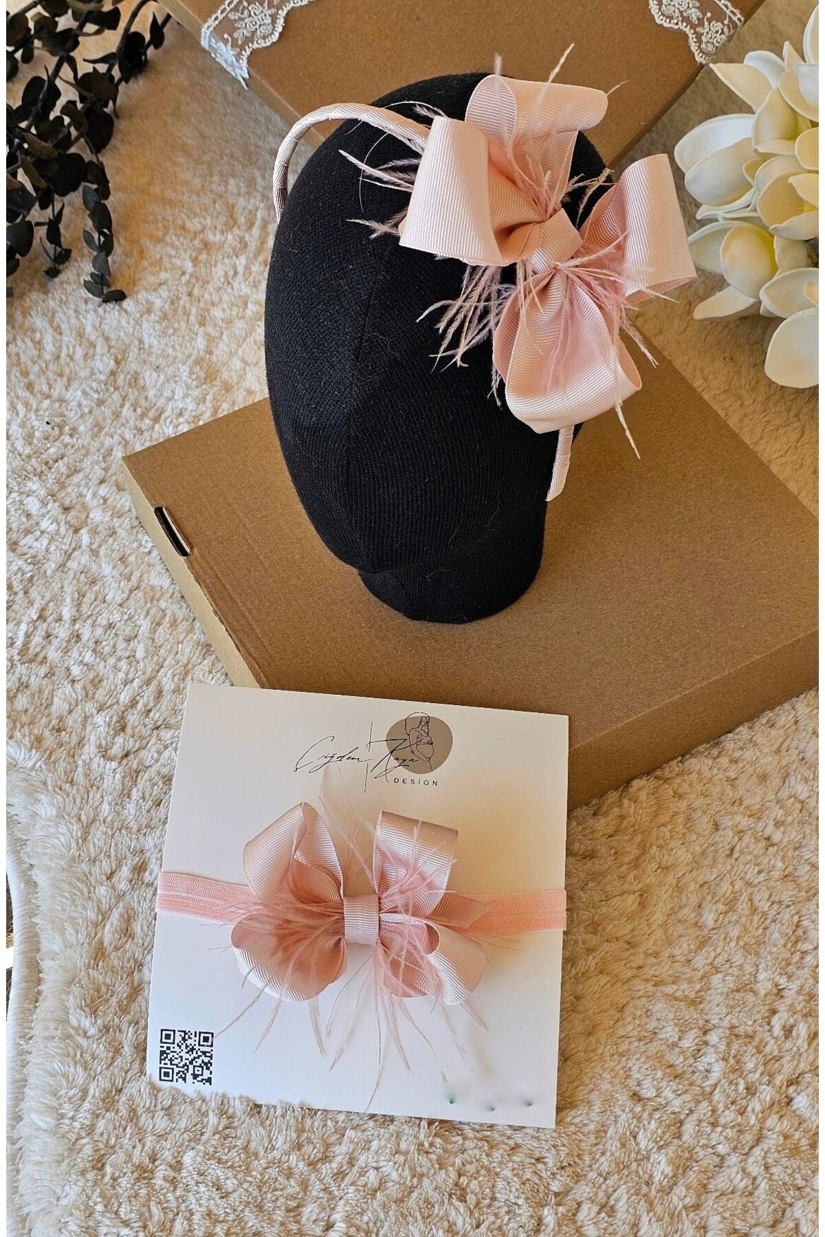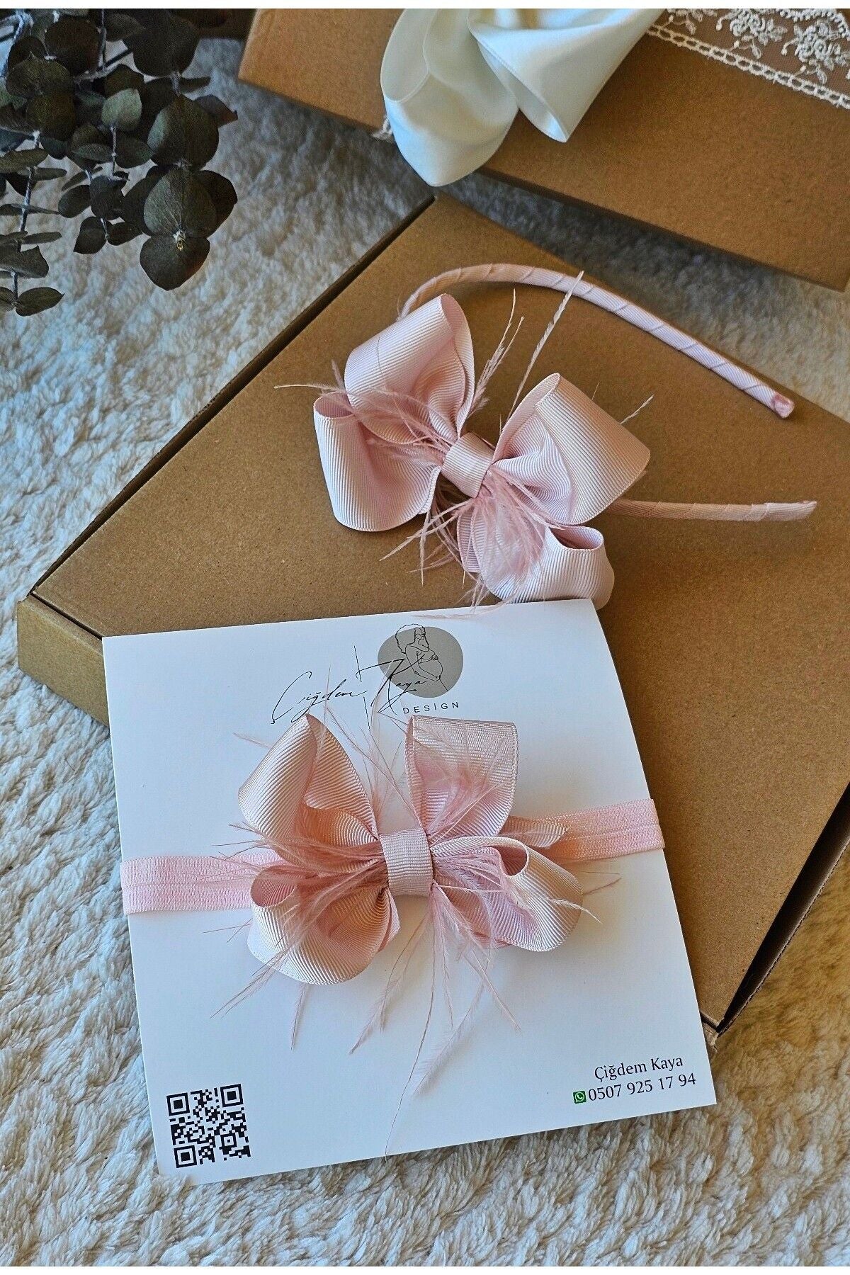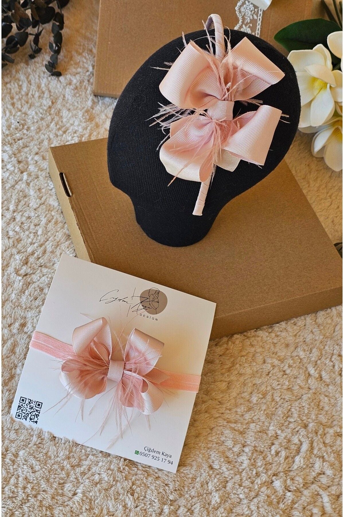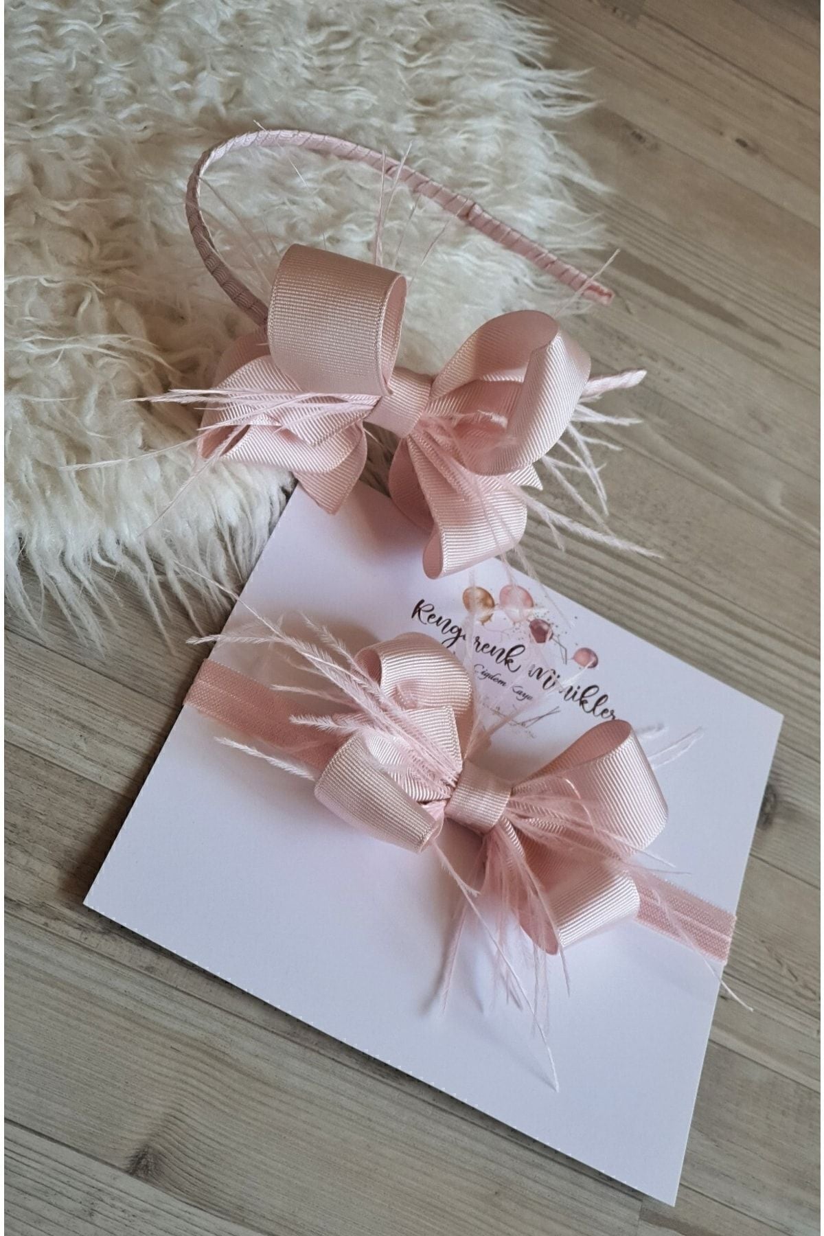 Pudra Pembesi Fiyonklu Tüylü Anne Bebek Lohusa Taç Seti