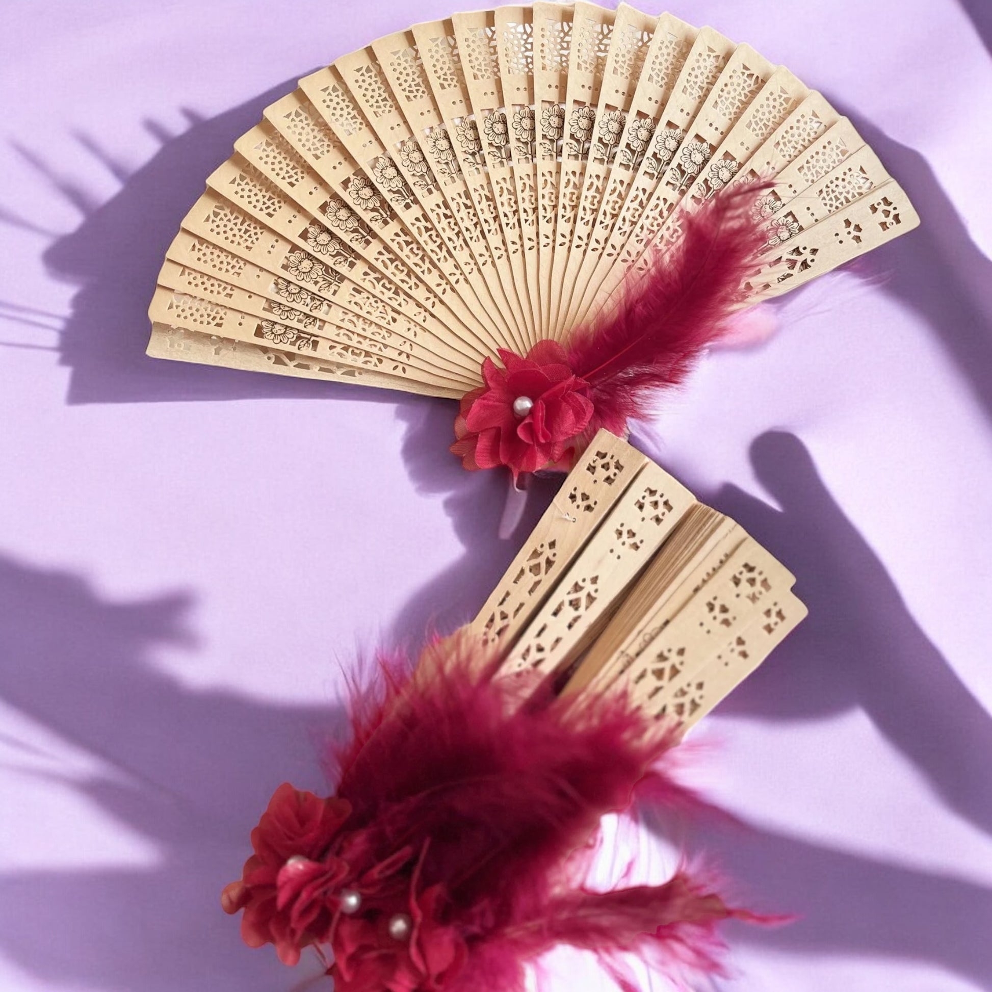 Tüylü Çiçekli Süslemeli Ahşap Yelpaze – Tüm Renk Seçenekleriyle Tekli