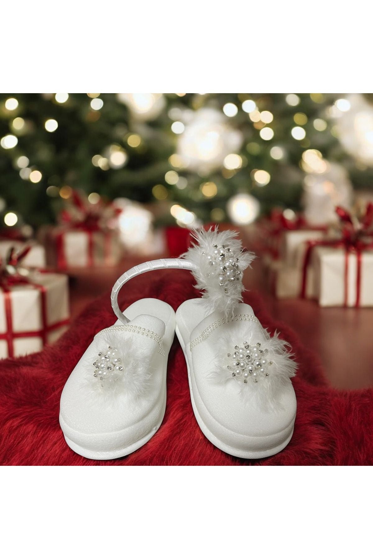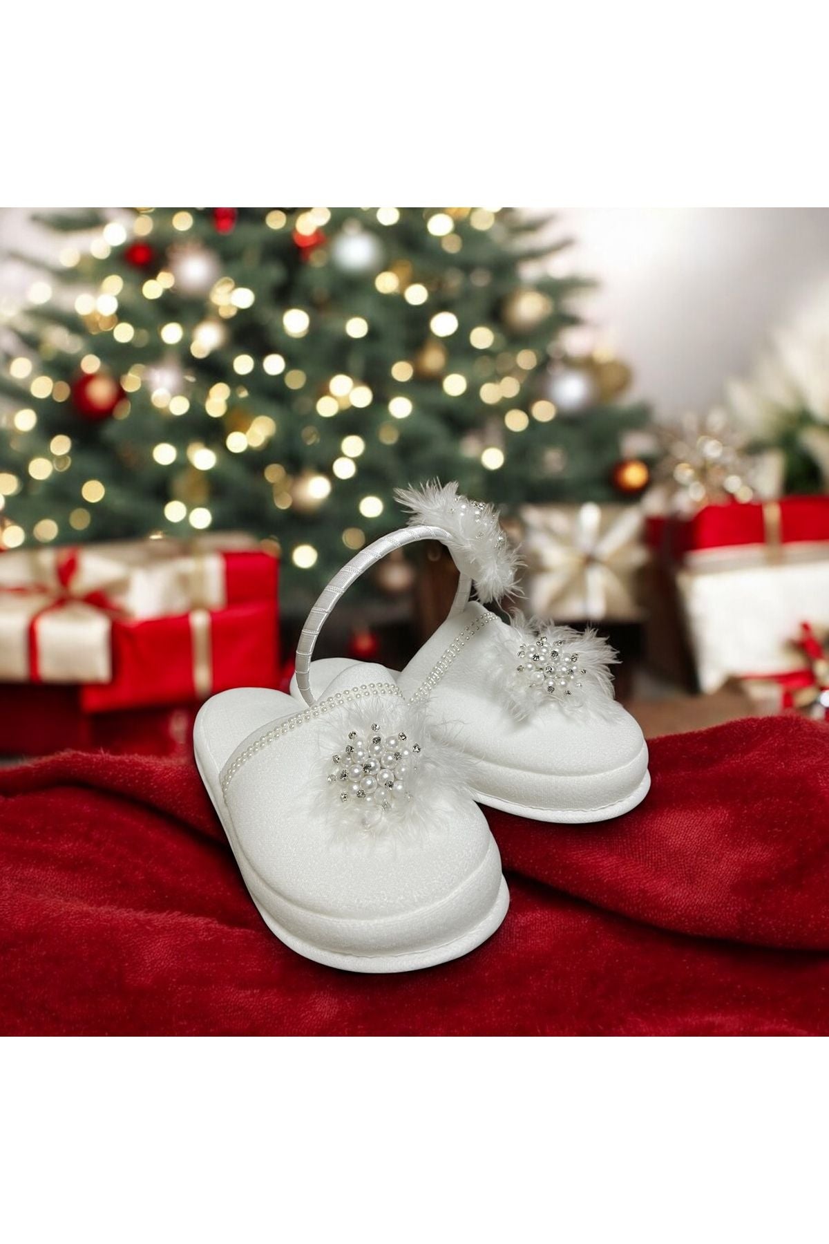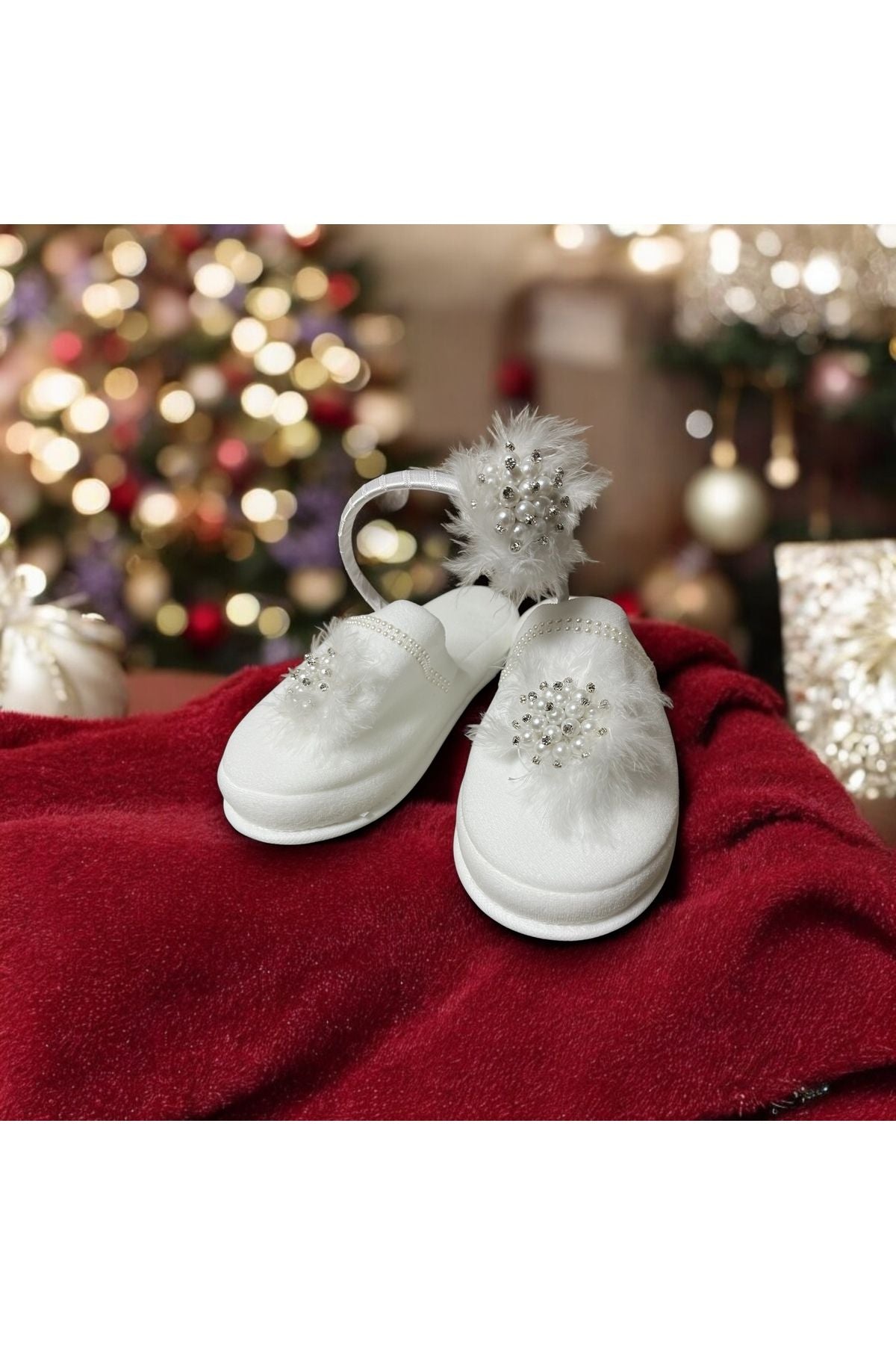 Tüylü İncili Kadın Lohusa Terliği ve Taçı